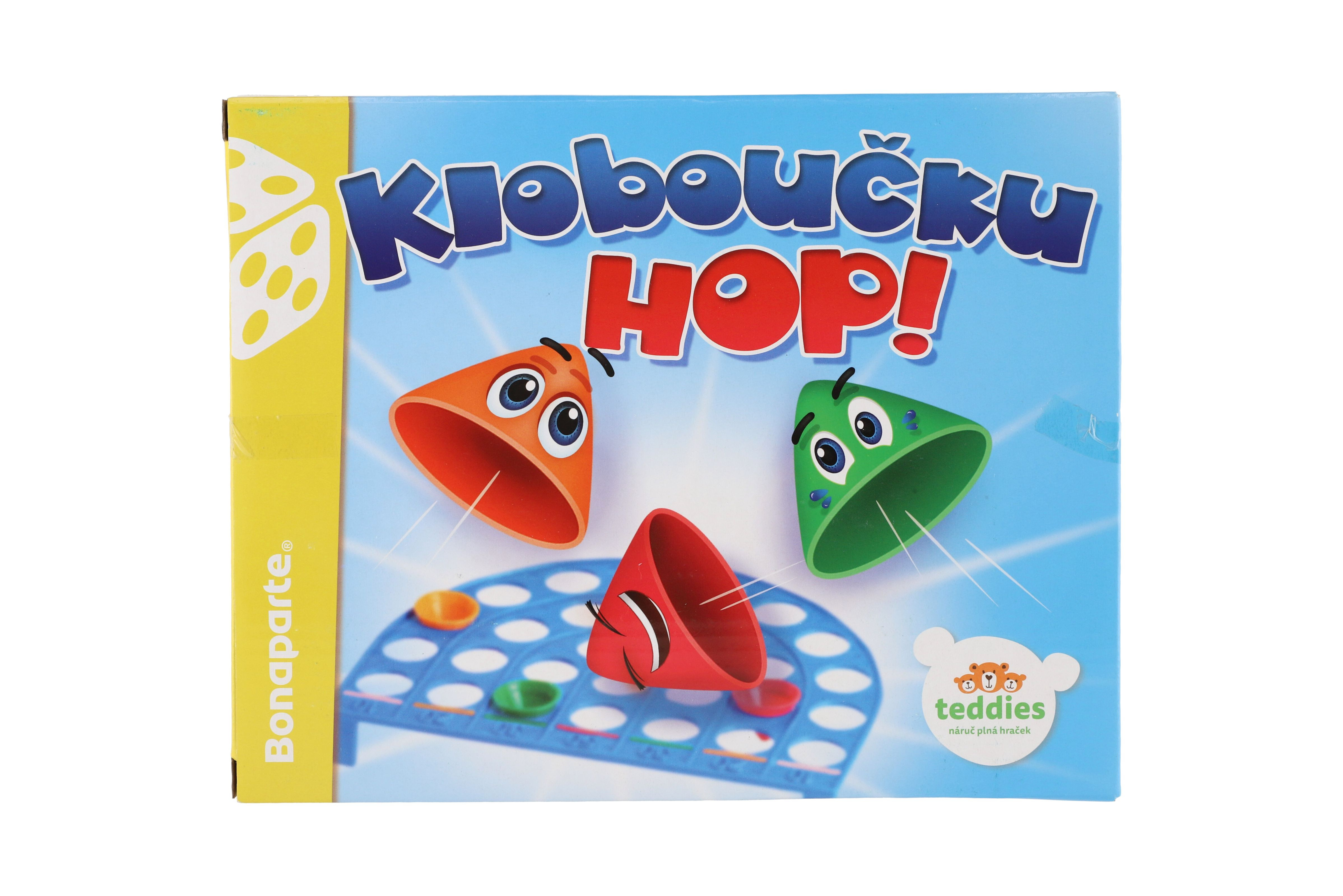 Kloboučku, hop! je společenská hra pro libovolný počet hráčů. Každý hráč střílí odpalovací rampičkou směrem k hernímu plánu a to vždy čtyřikrát, pokaždé kloboučkem jiné barvy. Pokud klobouček zapadne do otvoru v hrací desce, hráč si započítá hodnotu odpovídající danému pruhu. Hodnota bodů se zdvojnásobuje, jestliže klobouček zapadne do otvoru v pruhu označeném stejnou barvou, jako je barva kloboučku. Vyhrává hráč s nejvyšším počtem bodů. Vzdálenost rampičky od hracího pole závisí na schopnostech hráčů a jejich dohodě, v krabici. Rozměr krabice: 23 x 18 x 3,5 cm Vhodné od 3 let