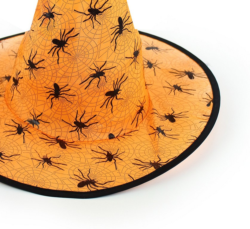 Senzační oranžový klobouk je dekorován pavučinami a pavouky. Klobouk je skvělým doplňkem na Halloween party nebo karneval! Staň se hvězdou večírku díky tomuto klobouku!