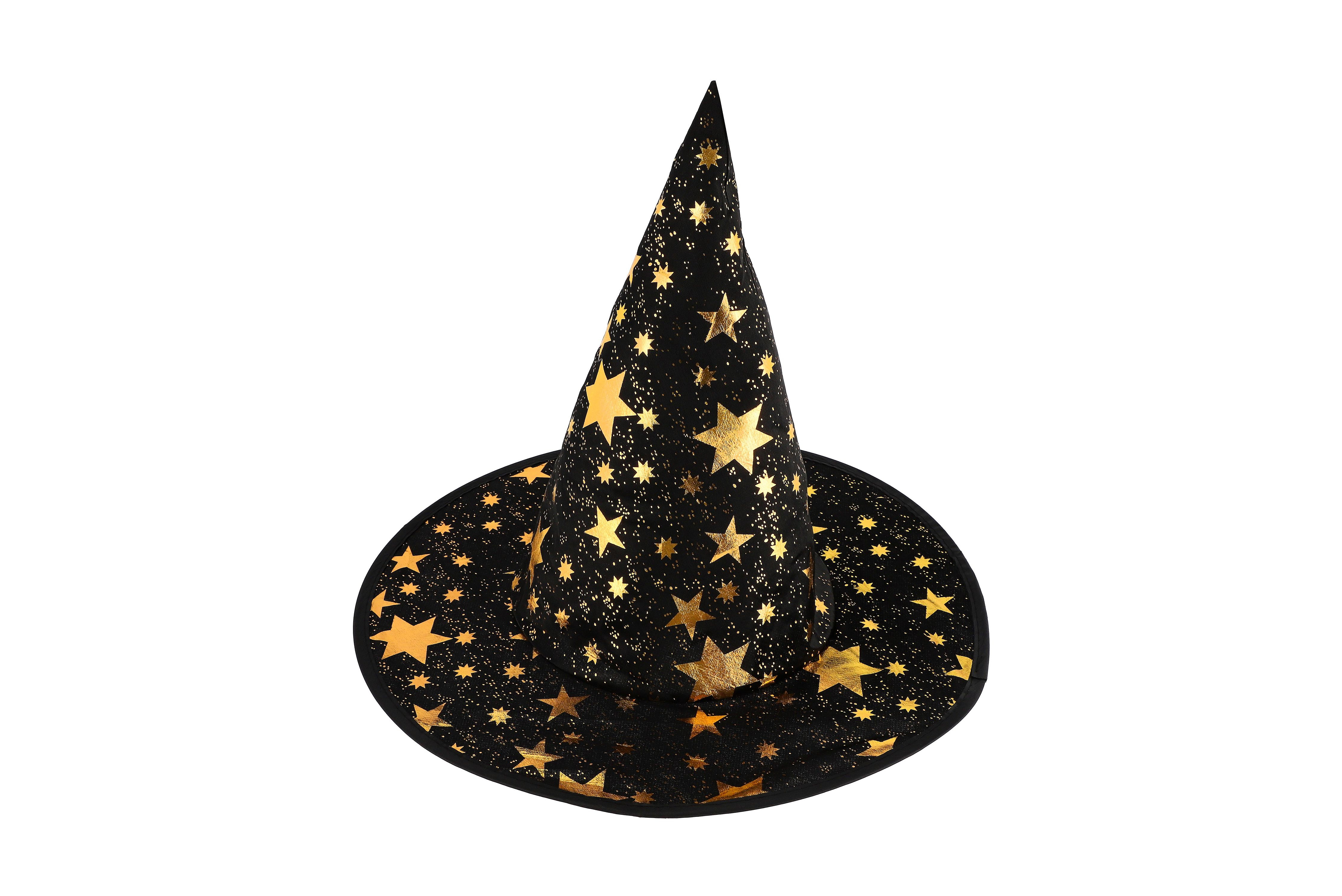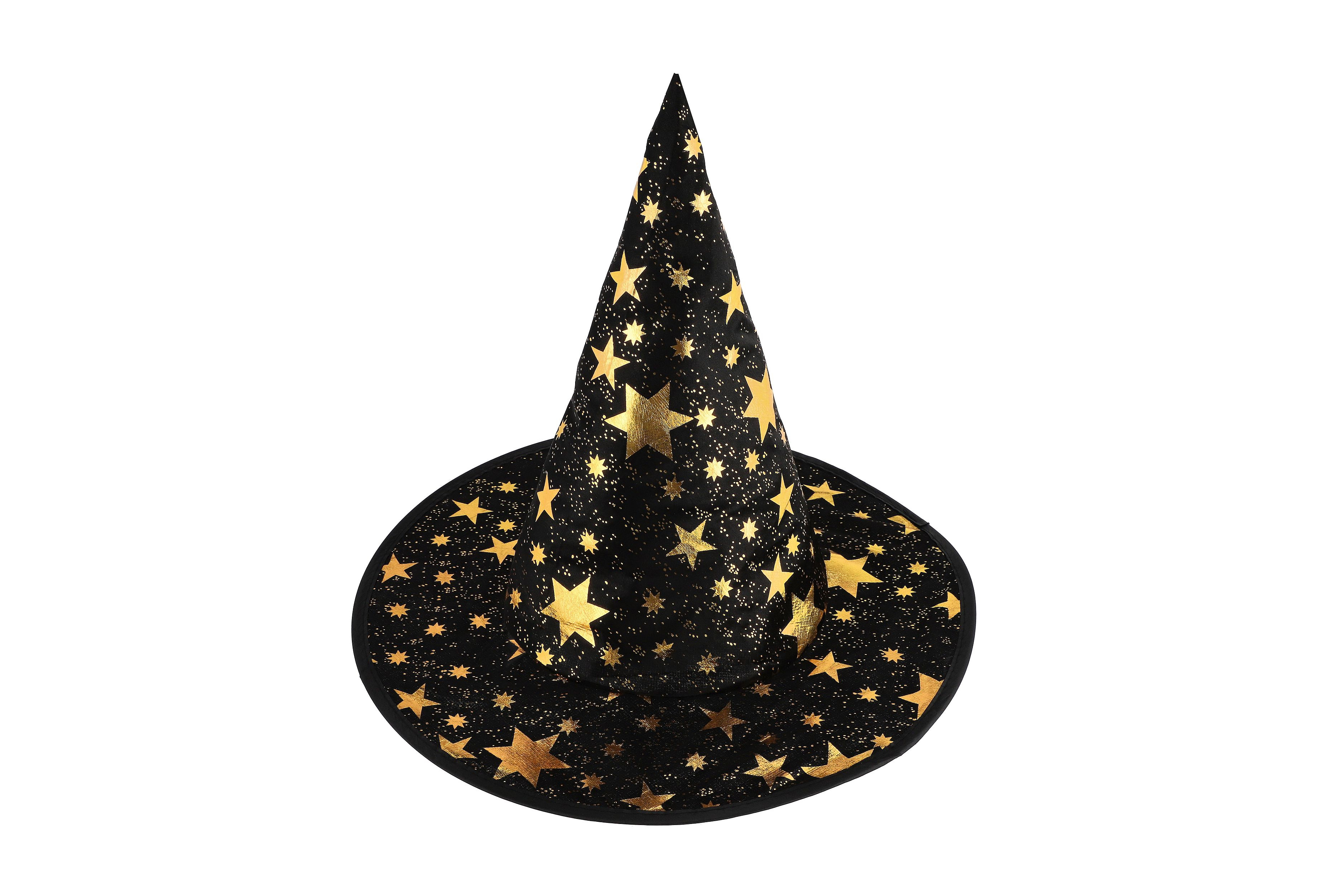 Čarodějnický klobouk s magickými motivy je skvělým doplňkem na Halloween párty nebo karneval! Kobouk je vyroben z černé síťky a je zdoben zlatými obrázky. Staň se hvězdou věčírku díky tomuto klobouku!