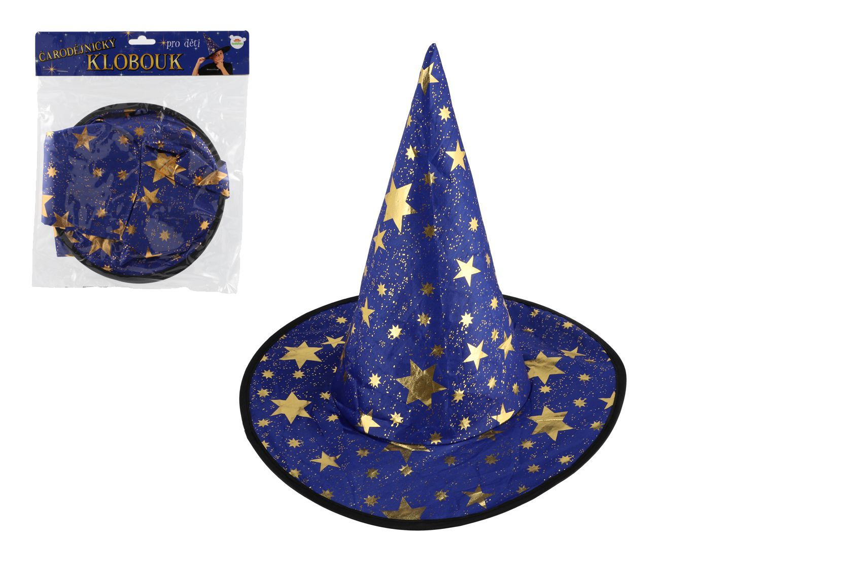 Popis Klobouk čarodějnický pro děti průměr 38cm modro-zlatý v sáčku karneval