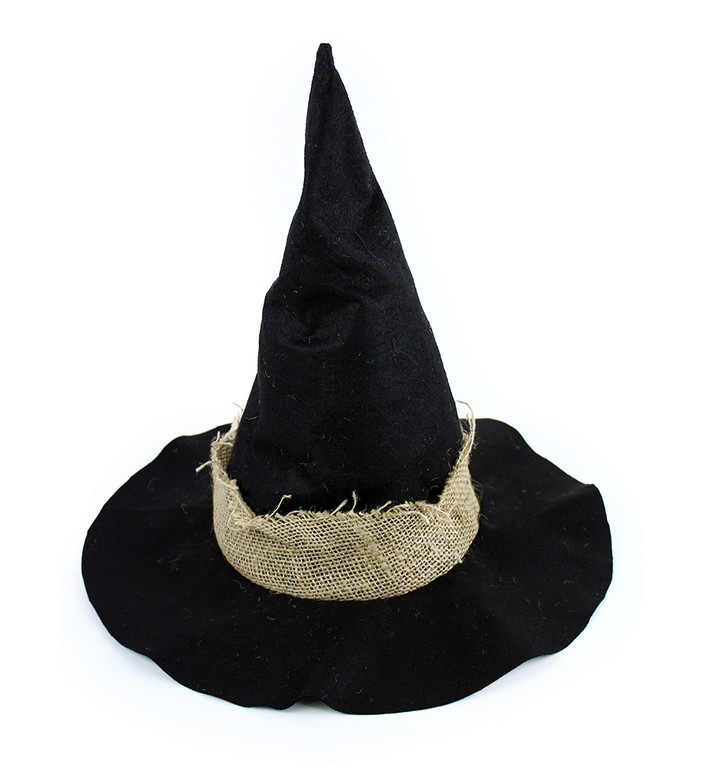 Čarodějnický klobouk je určen pro dospělé. Klobouk černé barvy je dekorován pruhem z pytloviny. Perfektní doplněk na Halloween párty nebo karneval!