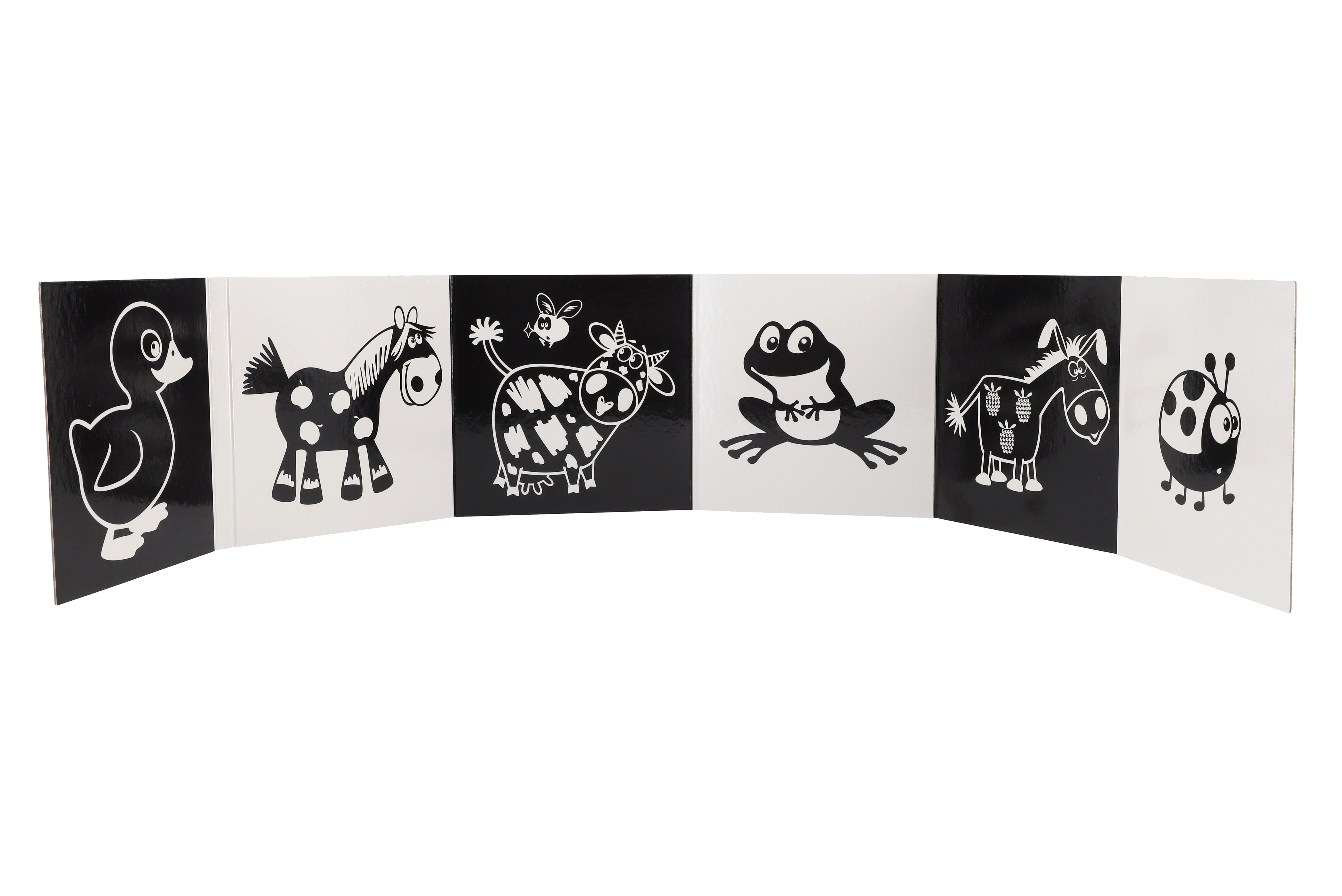 "Rozvíjejte u svého miminka vnímání a lásku ke knihám už od prvních týdnů života" Děti těsně po narození vnímají zejména ostré kontrasty světlých a tmavých ploch, které upoutají jejich pozornost. Proto je toto leporelo vhodné už od prvních týdnů života vašeho miminka, kdy trénuje jeho pozornost. později se podle roztomilých obrázků může učit poznávat jednotlivá zvířátka. Praktický tvar harmoniky umožňuje knížku rozložit a postavit před děťátko, i když zatím není schopno samostatného listování.