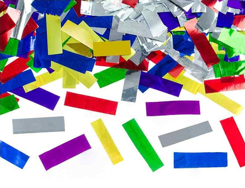 Konfety 40 cm, metalické barevné obdelníčky. Konfety jsou uloženy ve válcovité tubě. Drží se v ruce a ovládají se mechanickým pootočením tubusu. Po vystřelení vyletí barevné obdélníčky do výšky 5 až 8 metrů a rozptýlí se do okolí. Bezpečnost: konfety lze použít ve venkovních i vnitřních prostorách. Bezpečná vzdálenost přihlížejících diváků od tuby konfet je 10 metrů. Iniciace stlačený vzduch. Tubus kov. Manipulace pootočení. Max délka odpálení 5–8 m.