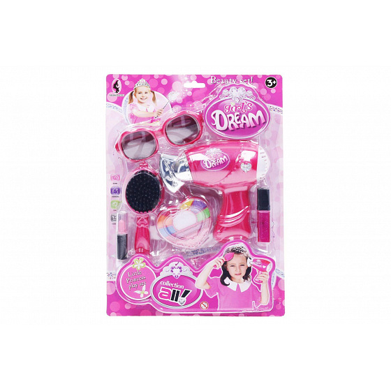 Kosmetický set. Obsahuje brýle, fén, kartáč, malování, rtěnku, parfém. 2xAA baterie fén, nejsou součástí. Aktivace foukání stiskem tlačítka.