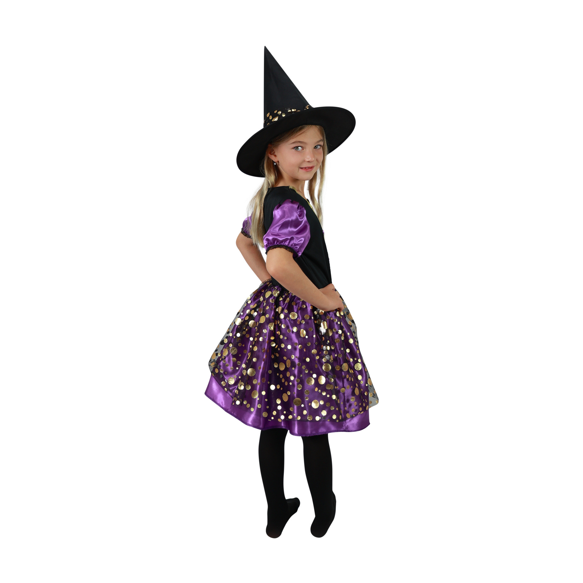 Roztomilý karnevalový kostým s motivem čarodějky udělá radost každé holčičce! Souprava obsahuje šaty a klobouk. Set ve velikosti S je určen pro holčičky ve věkovém rozmezí 4-6 let (110-116 cm). Staň se nejhezčí čarodějnicí karnevalu díky tomuto kostýmu!