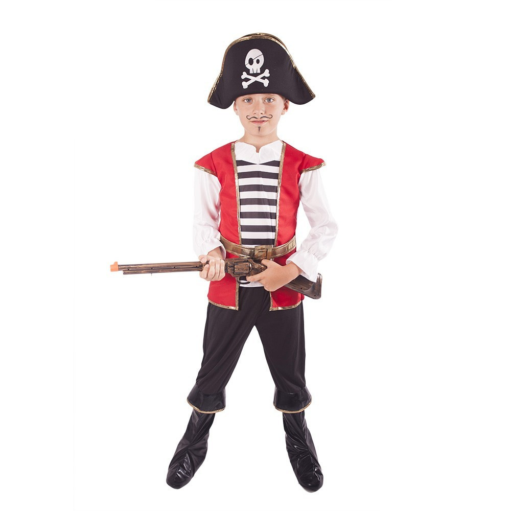 Chystáš se vyplout na pirátskou výpravu? Tak si pořiď ten správný kostým a vzhůru na palubu! Kostým, ve velikosti M je určen pro chlapce ve věkovém rozmezí 6-8 let. Balení obsahuje horní díl, kalhoty s návleky na boty a stylovou pirátskou čepici.