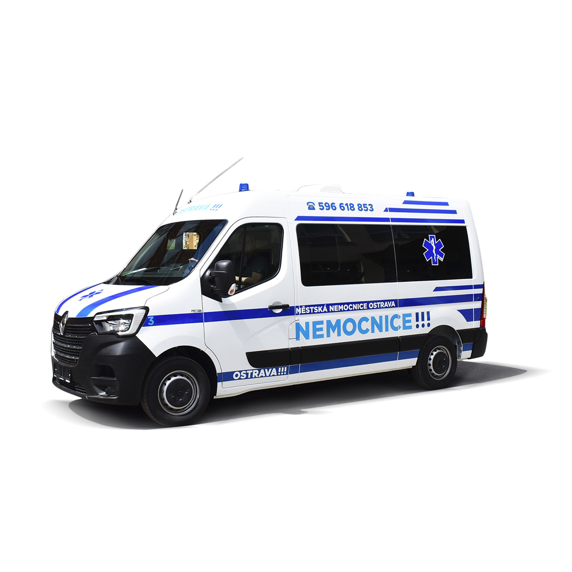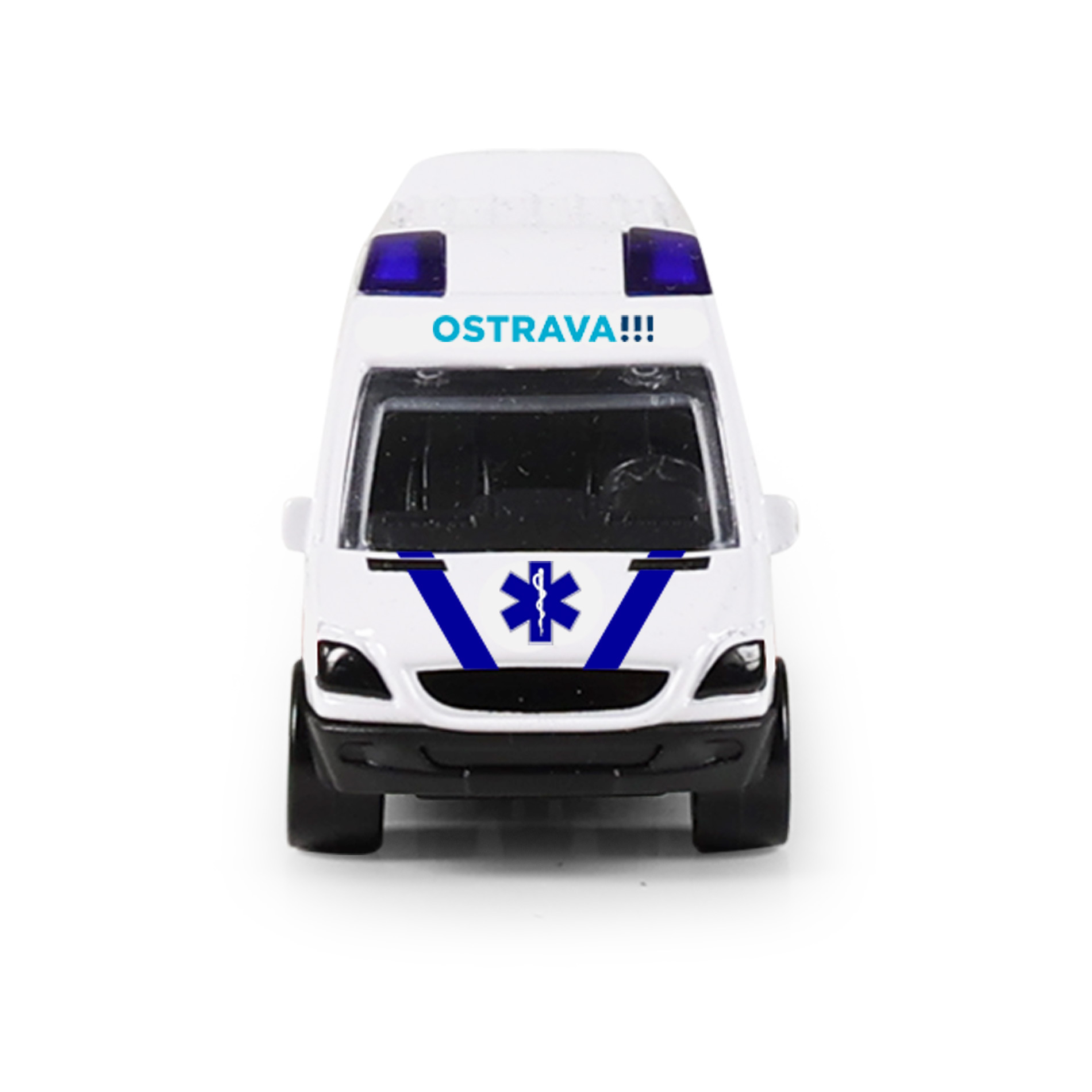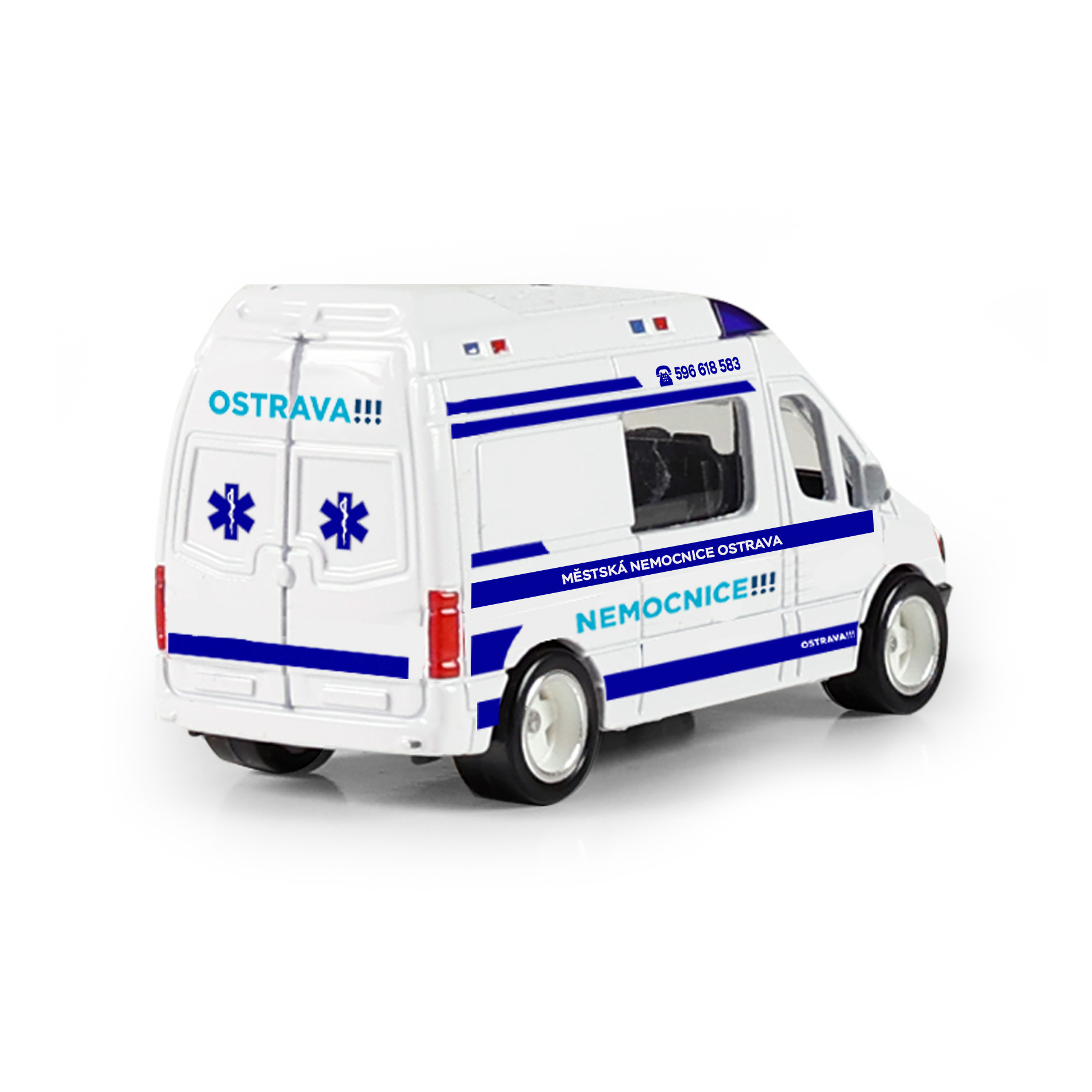 Model kovové sanitky s motivem Městská nemocnice Ostravy. Autíčko jezdí na volný chod a určitě potěš