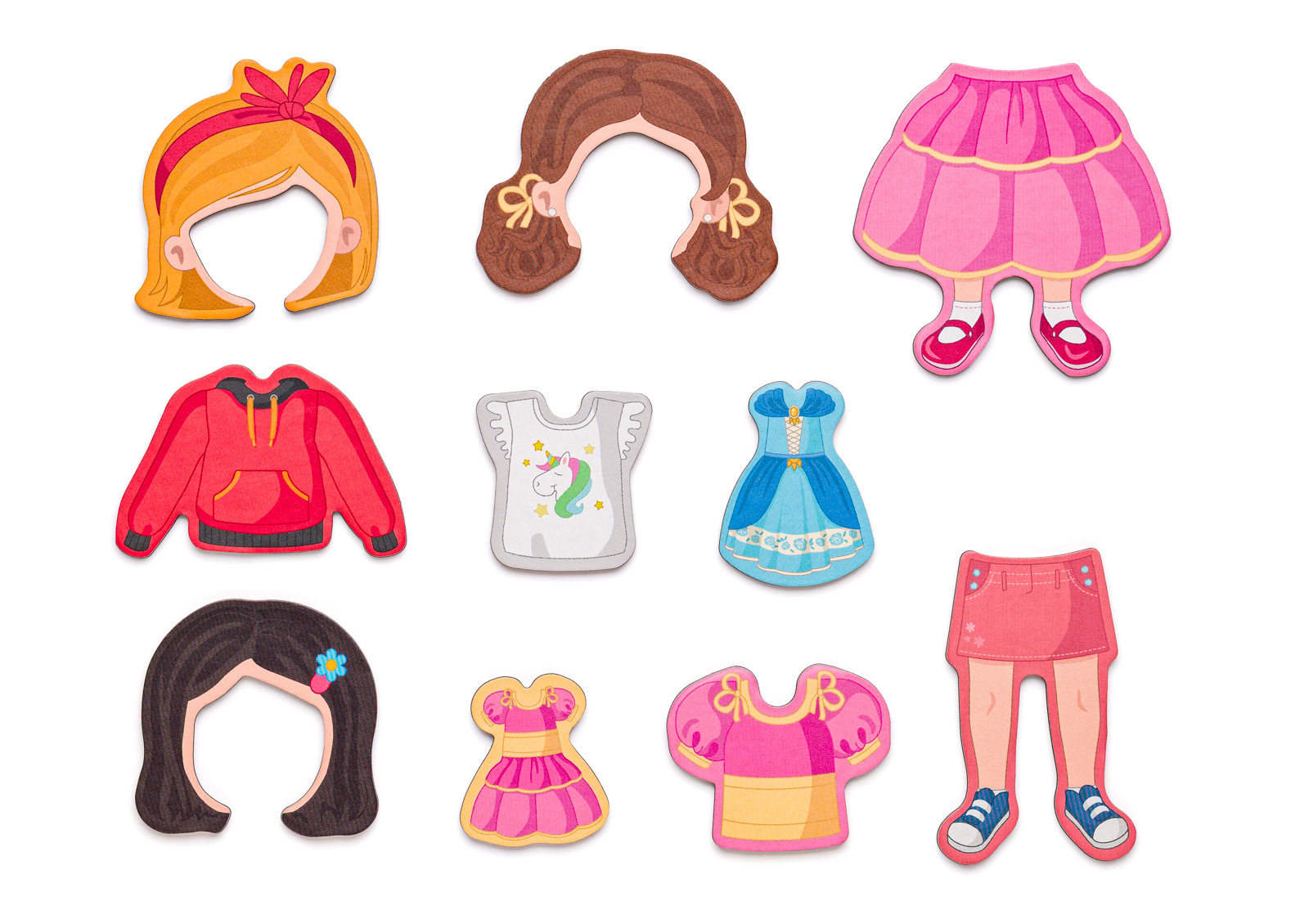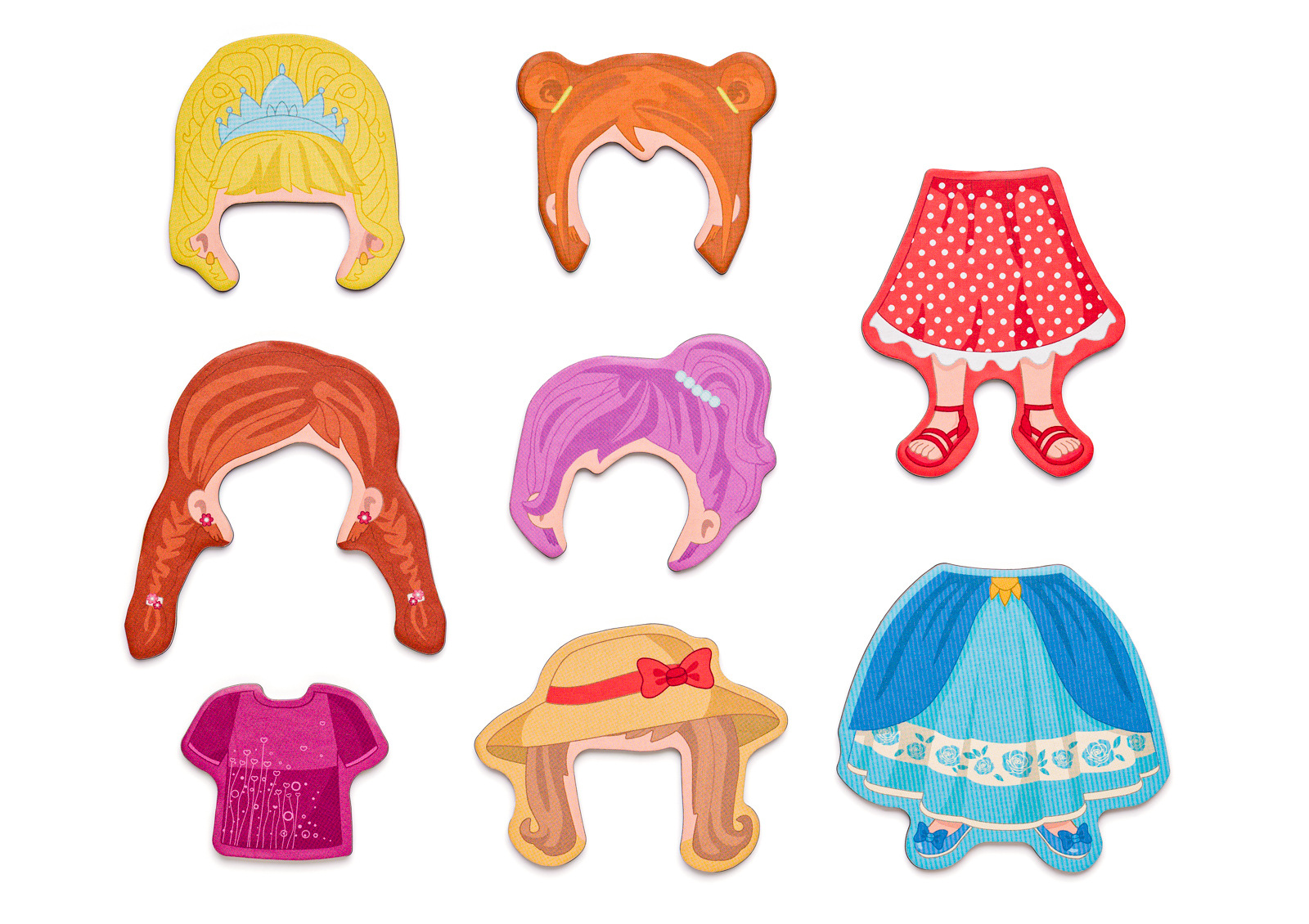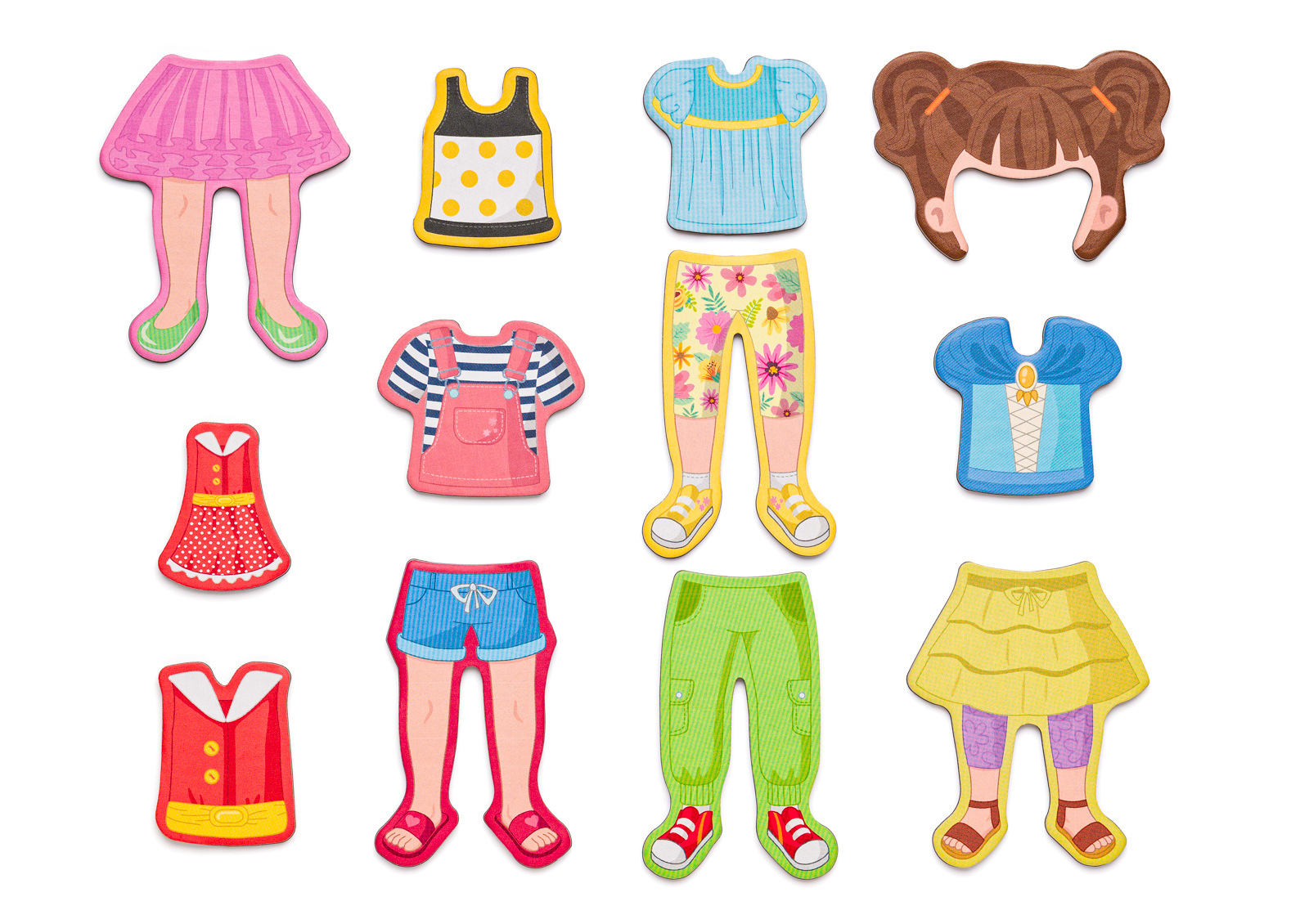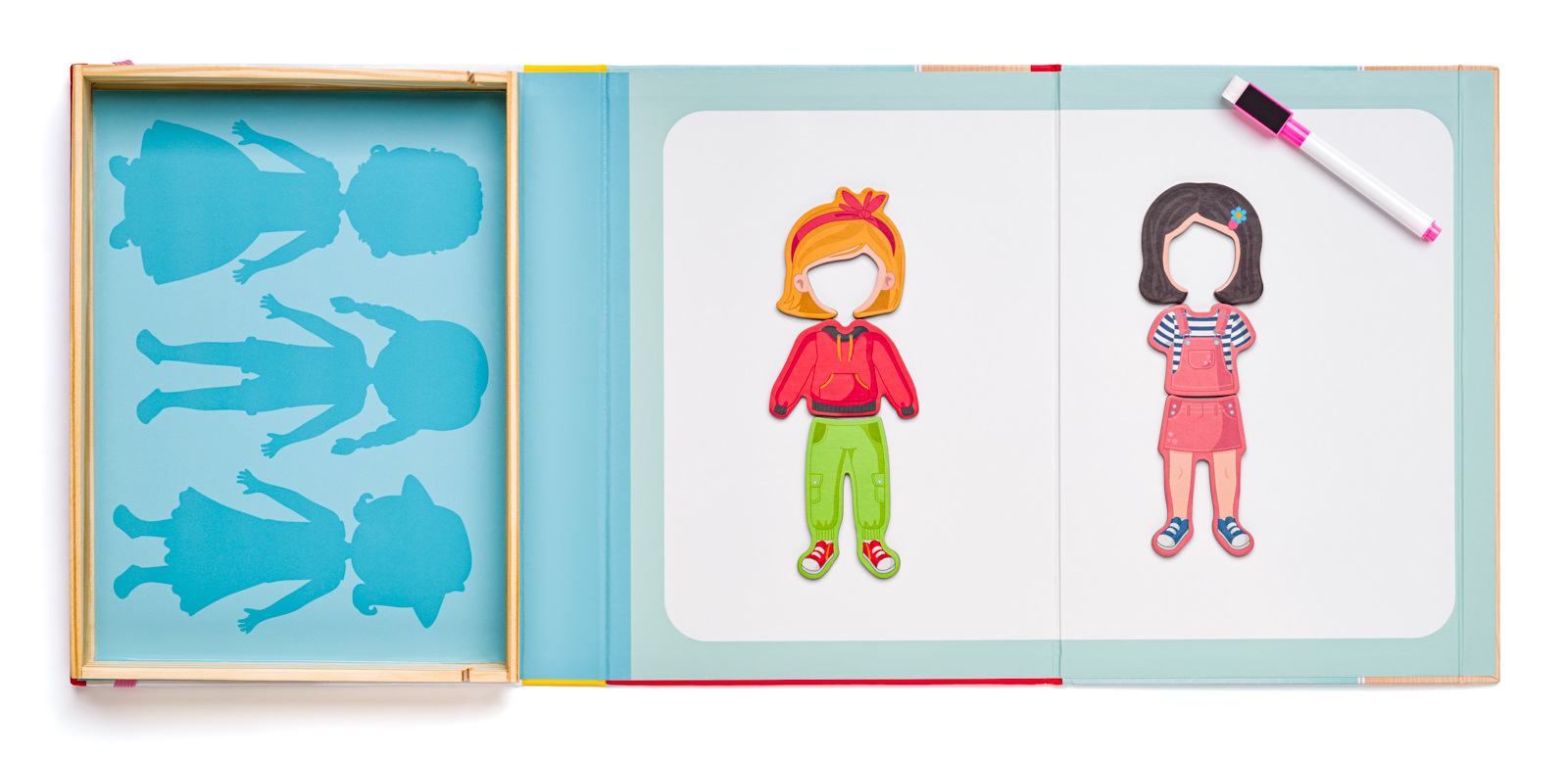 Stylová zábava pro malé módní návrhářky! Otevřete dřevěnou krabičku plnou magnetických oblečků a vytvořte dokonalé outfity pro dvě holčičky vyobrazené na magnetickém víku. Kombinuj trička, sukně, kalhoty, šaty i účesy – a nezapomeň obléct i jejich panenku! Inspiruj se přiloženými kartičkami s módními tipy. Z druhé strany magnetického víka se nachází plocha na malování. Malovat můžete přiloženým mazacím fixem, který je zároveň vybaven houbičkou. Malujte znovu a znovu. Magnetické tvary lze přiložit z obou stran magnetického víka. Celá sada je v dřevěné krabičce, která má zavírání opatřeno pevnou gumičkou. Můžete tak sadu s sebou vzít pohodlně i na cesty Hra rozvíjí dětskou kreativitu a jemnou motoriku. Obsah sady: 30 magnetických tvarů, 8 kartiček s inspirací a mazací fix s houbičkou. Rozměry balení: 20 x 27 x 4 cm. Věk: 3+