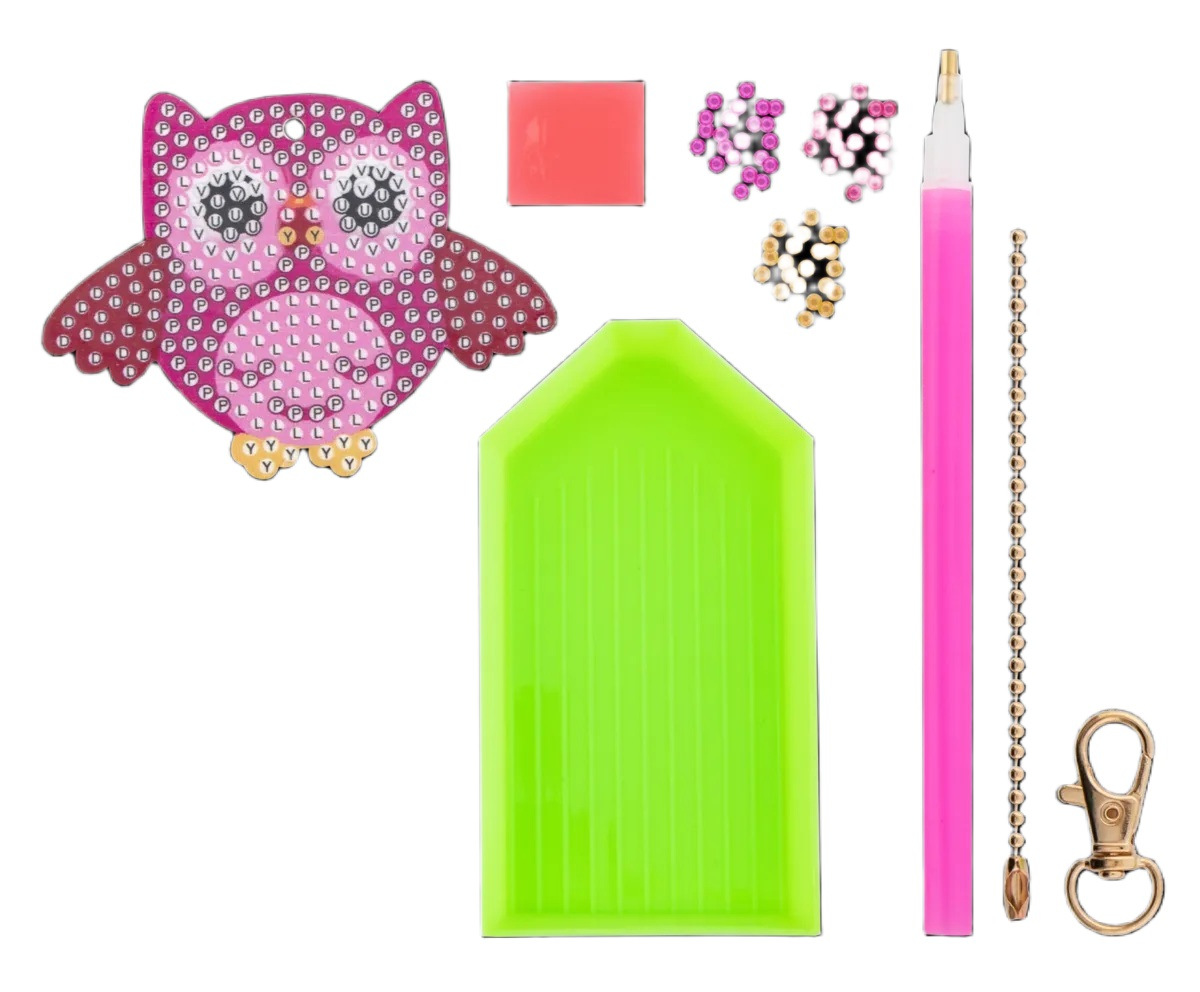 Kreativní set vyrob si svůj diamantový přívěsek ve tvaru sovy. Součástí balení je přívěsek,různě barevné diamanty/kamínky, lepící sada s perem k lepení a umisťování drahokamů do přívěsku, tácek, řetízek a karabinka. Tento parádní přívěsek lze nosit na batohu, klíčích nebo kdekoliv jinde tě napadne.
