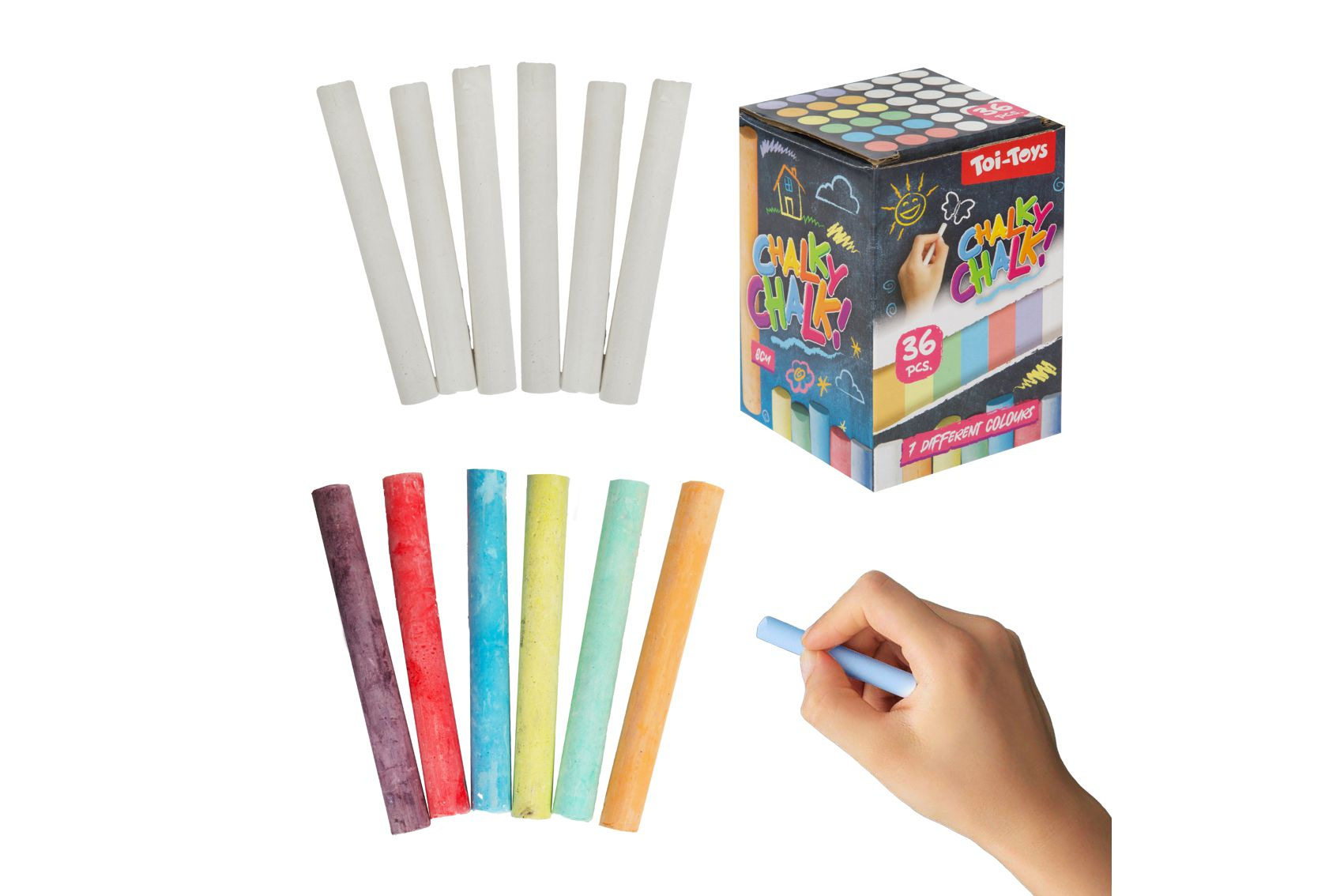 Klasické tabulové křídy v praktickém balení pro každodenní psaní, kreslení a výuku. Kombinace bílých a barevných kusů nabízí variabilitu pro psaní i zvýraznění. Vhodné pro: školní tabule (klasické i domácí), dětské kreslení venku na chodník, dekorativní nápisy (např. na menu tabulích). Rozměry balení 6 x 9 x 6 cm Vhodné pro děti od 2 let