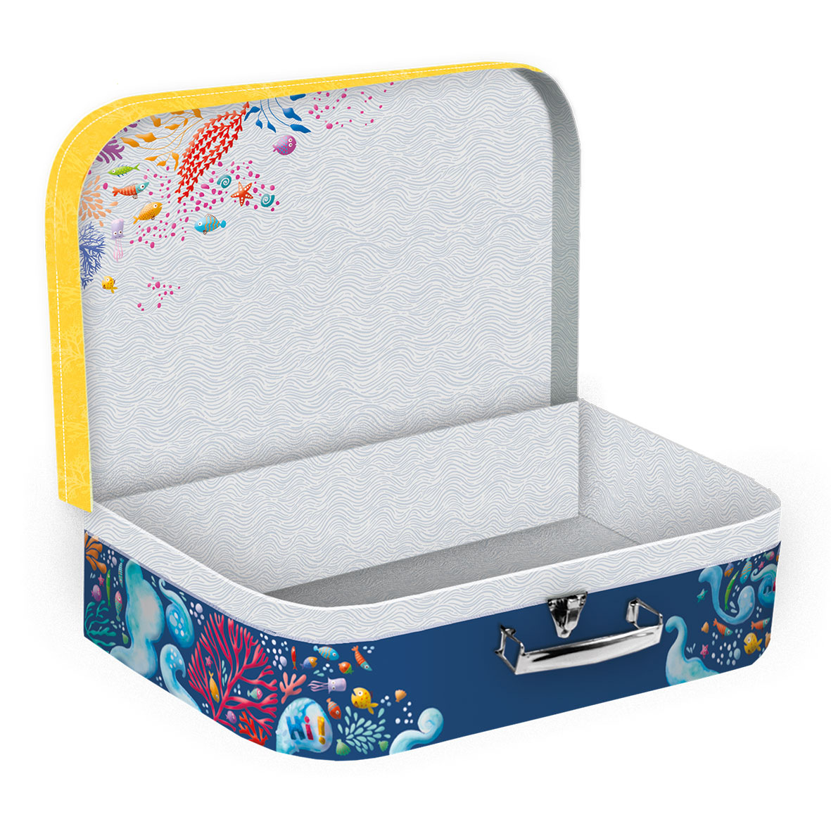Papírový školní kufřík, šířka 25 cm, kovová rukojeť. Ideální pro uložení výtvarných potřeb, školních