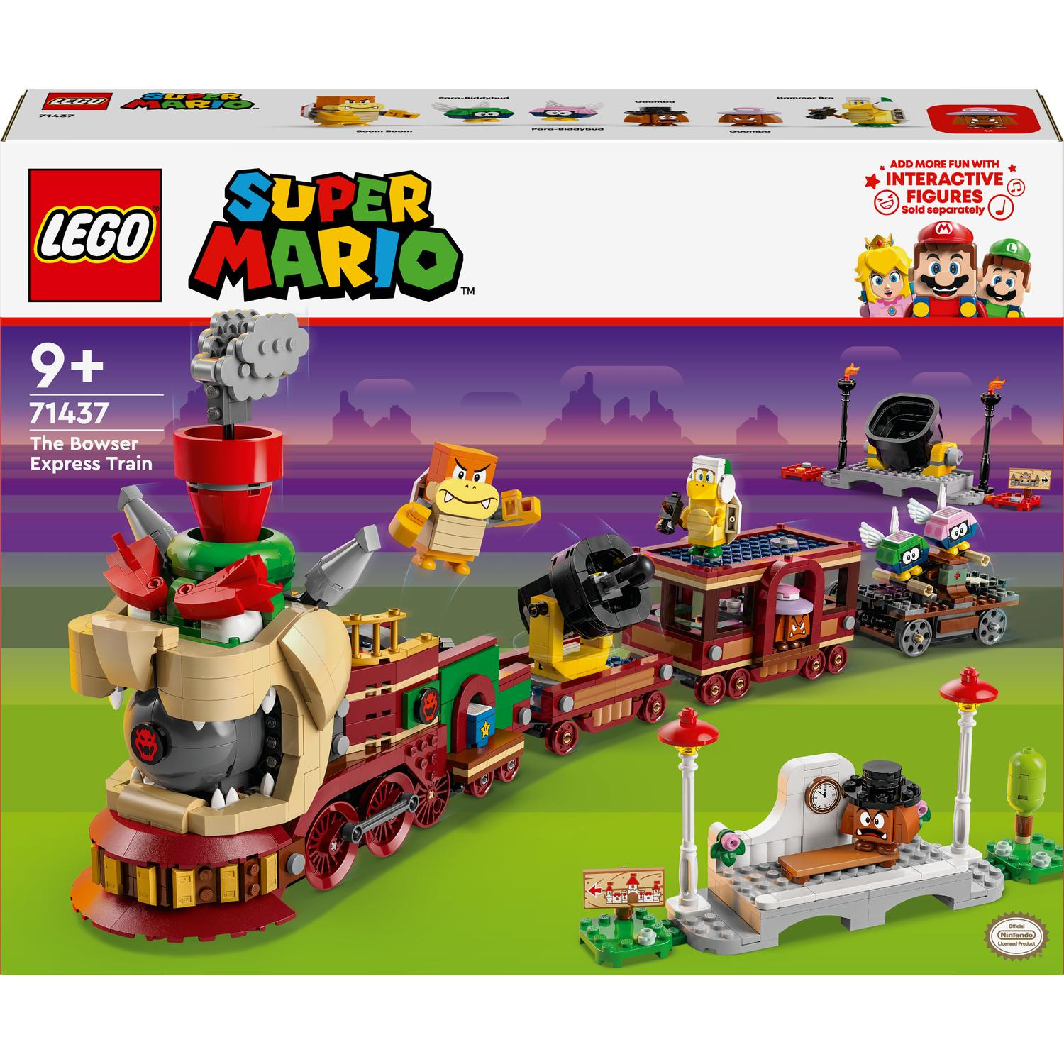 S modelem LEGO® Super Mario™ (71437) Bowserův rychlík se můžete pustit do akčních jízd! Tato dobrodružná dětská stavebnice Nintendo® představuje skvělý dárek pro kluky, holky a milovníky videoher od 9 let a součástí je propracovaný vláček, drezína, 2 stanice, akční kostka Super Star, akční kostka s otazníkem a 6 figurek LEGO Super Mario – Hammer Bro, Boom Boom, 2 Goombaové a 2 Para-Biddybudové. Přidejte figurku LEGO® Mario™, LEGO® Luigi™ nebo LEGO® Peach™ (nejsou součástí balení) a užijte si s nimi porci interaktivního hraní. Naskočte s nimi do drezíny a pronásledujte spolu vlak, ovládejte otáčecí plošinu na lokomotivě a aktivujte pružinový vystřelovač dělového vagónu. Až všechny nepřátele porazíte, uslyšíte zvuk klaksonu, když budete v Bowserově rychlíku přijíždět na stanici. Návod na stavění najdete v krabici nebo v doprovodné aplikaci LEGO Super Mario, ve které najdete také kreativní nápady na stavění a hraní s tímto Nintendo setem. Rozměry – Tento set Bowserova rychlíku se skládá z 1 392 dílků a měří přes 22 cm na výšku, 68 cm na šířku a 12 cm do hloubky a lze ho zkombinovat s dalšími sety LEGO® Super Mario™ (prodávají se samostatně)
