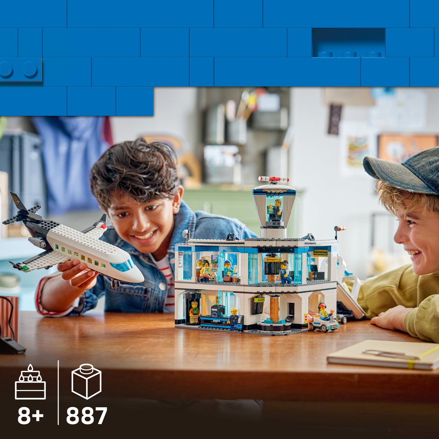 Dětská fantazie může zamířit k výšinám se stavebnicí LEGO® City Letiště s letadlem (60502) pro děti od 8 let. Tento propracovaný model letiště je plný prvků a funkcí pro živou hru. Děti můžou zkontrolovat zavazadla pomocí skeneru, otočit detektor kovů a odhalit rentgenový snímek kostry, a změnit odletovou tabuli, na které si vyberou ze 4 destinací. Stavebnice obsahuje také stylové dopravní letadlo s propracovanou kabinou a sklopnými schody, letištní tahač a nástupní most. Stačí přidat 9 minifigurek a zahájit hodiny nápaditého hraní. Tato hračka letiště poslouží jako skvělý dárek pro kluky a holky, kteří milují modely letadel a stavebnice LEGO. Přidejte model k dalším stavebnicím z řady LEGO City (prodávají se samostatně) a zažijte ještě větší dobrodružství. Spojte se a přáteli nebo rodinou a využijte režim Stavějte společně v aplikaci LEGO Builder, díky kterému každý staví část modelu pomocí vlastního zařízení. Stavebnice obsahuje 887 dílků.