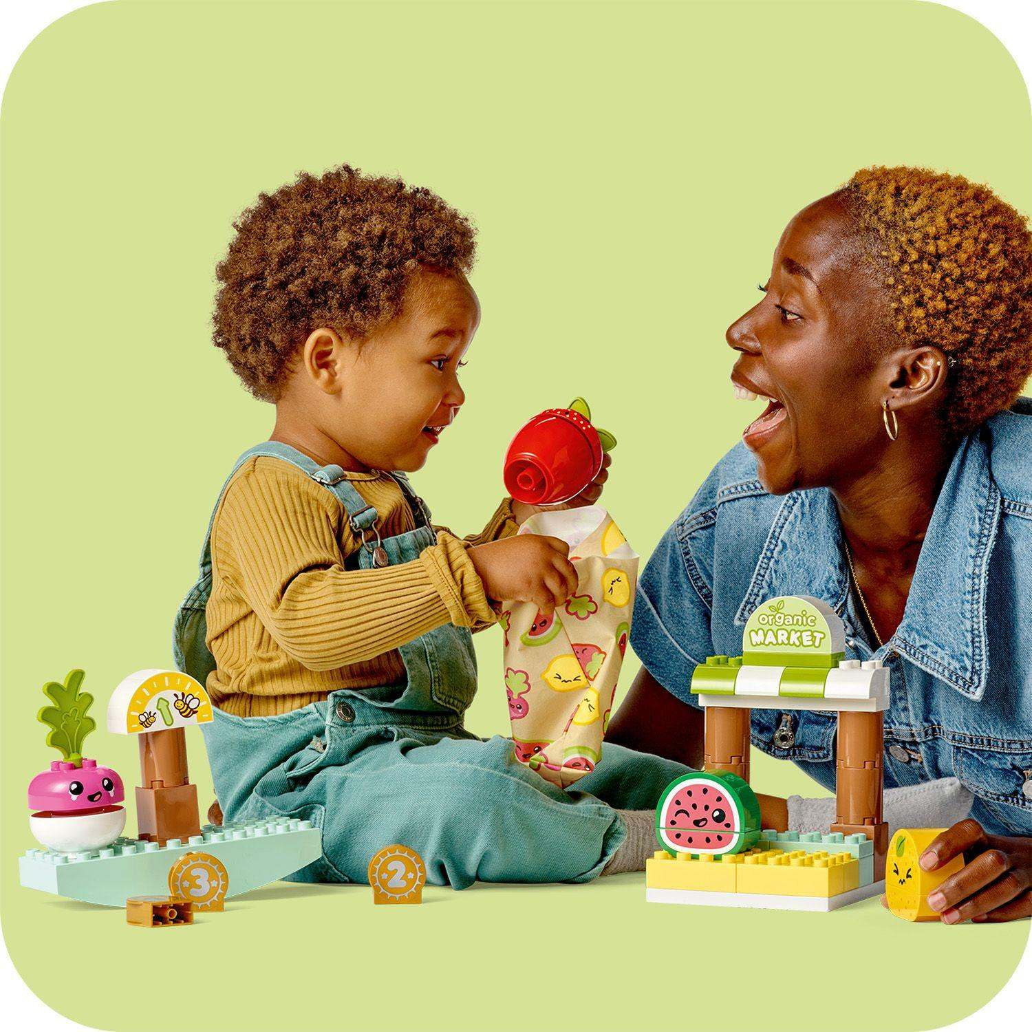 Hračky LEGO DUPLO dávají těm nejmenším možnost zažít neomezené tvoření, sebevyjádření a zábavné učení. Tato stavebnice inspiruje děti a dospělé k společnému interaktivnímu hraní, ve kterém se z jednoho stane stánkař s ovocem a zeleninou a z druhého zákazník. Stavebnice DUPLO umožní rodičům a malým dětem sdílet vzácné vývojové milníky, zatímco si spolu hrají a staví.