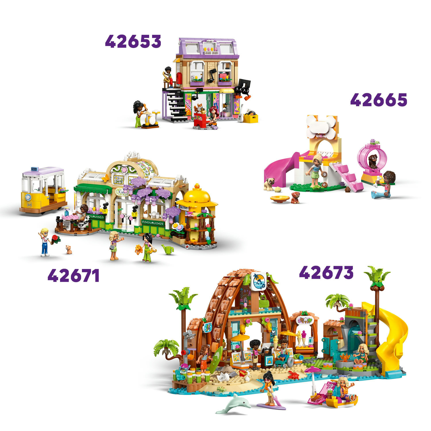 Popis LEGO Friends 42666 Kočičí narozeninová oslava a dům na stromě