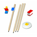 Set s klasickým LEGO motivem a LEGO minifigurkou obsahuje 4 tužky, LEGO klip na uchycení tužky, ořezávátko, mazací gumu a minifigurku.