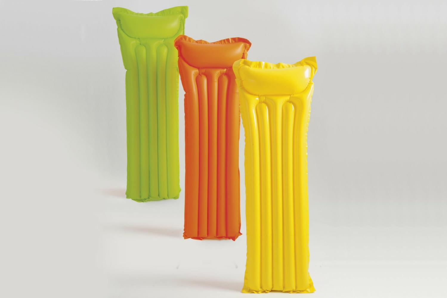 Nafukovací lehátko o rozměrech 183 x 69 cm, v zářivých barvách a s integrovaným polštářem. 2 vzducho