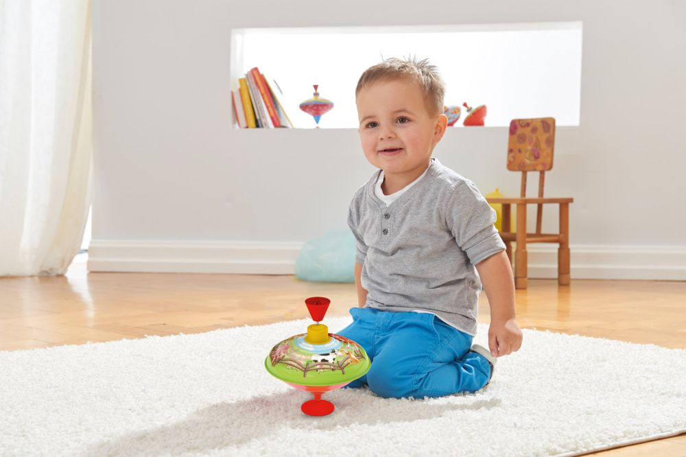 Kovová hrající káča s motivem statku o průměru 16cm. Vhodné od 18 měsíců.
