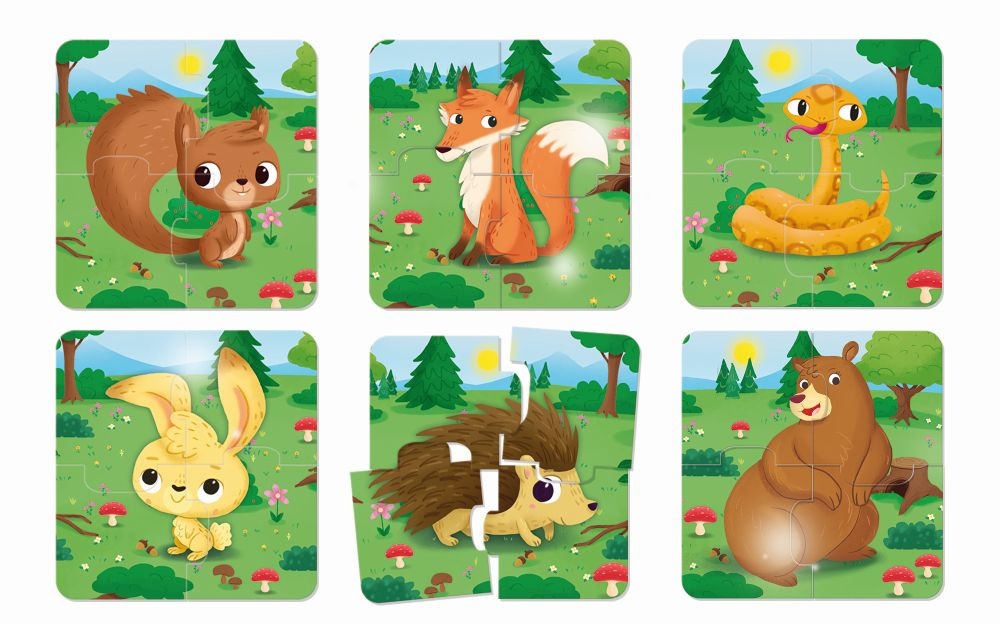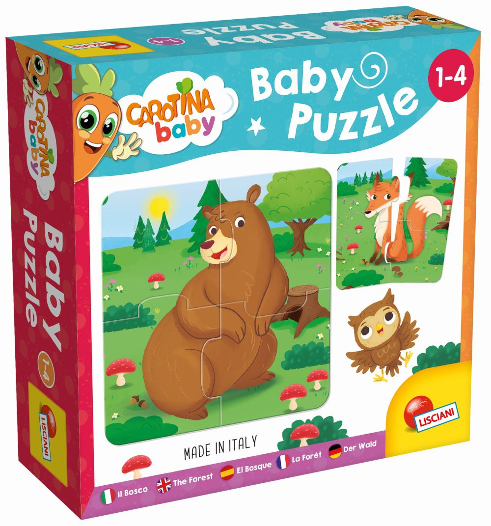 Spousta zábavných hlavolamů s přáteli z lesa. Rozvíjejte pozorovací schopnosti a poskládejte obrázky z dílků správně. Sada obsahuje 24 dílků z kterých složíte 6 obrázků. Vyrobeno z bezpečných materiálů vhodné pro děti od 1 roku.\nCarotina je značka společnosti Lisciani a představuje její vzdělávací jádro. Značka je především zaměřena na předškoláky a kojence.