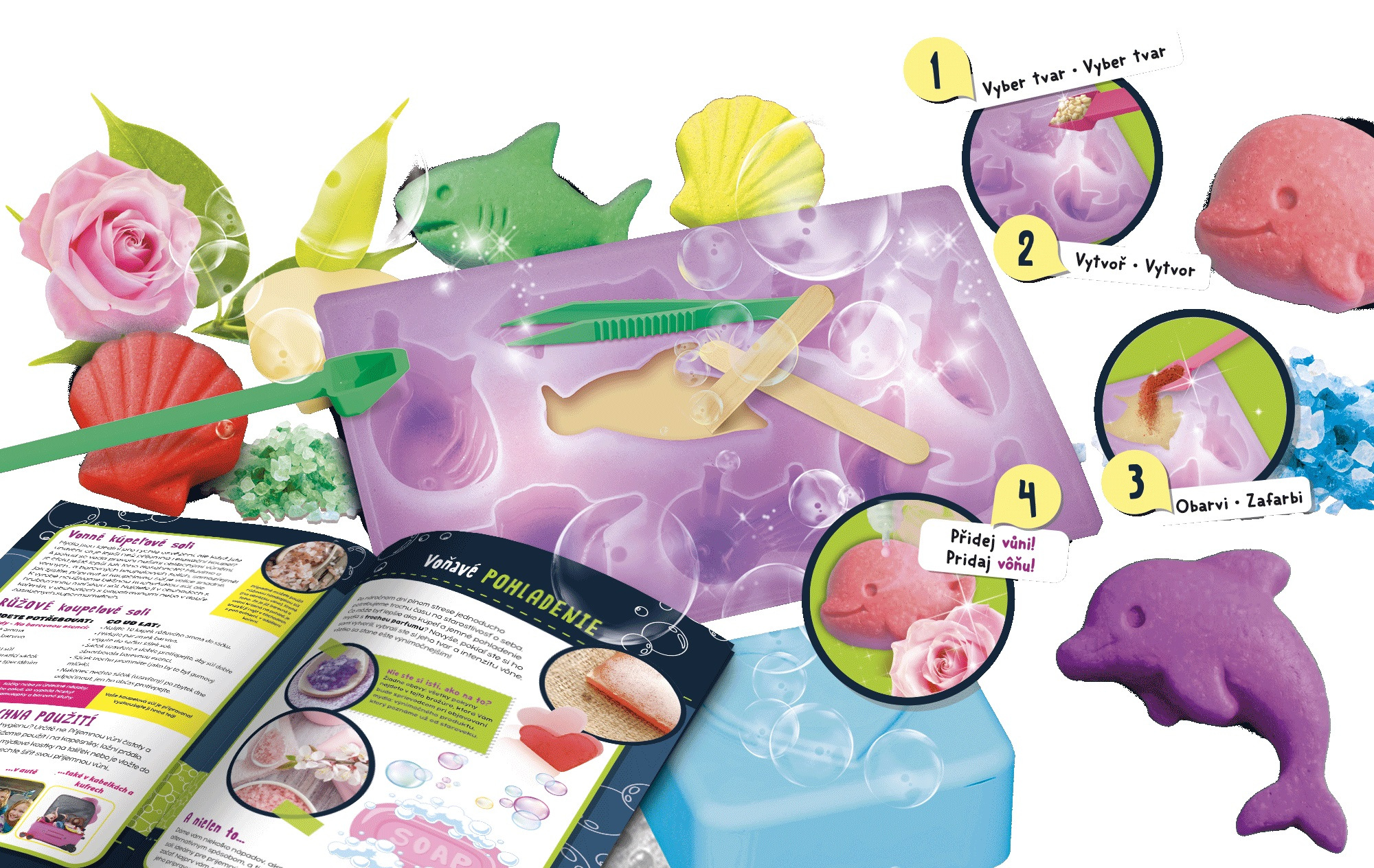 Kreativní sada na výrobu mýdel. Sada obsahuje : formičky na mýdlo, barevnou esenci, vůni, glycerinové vločky, dřevěnou špachtli a odměrku.