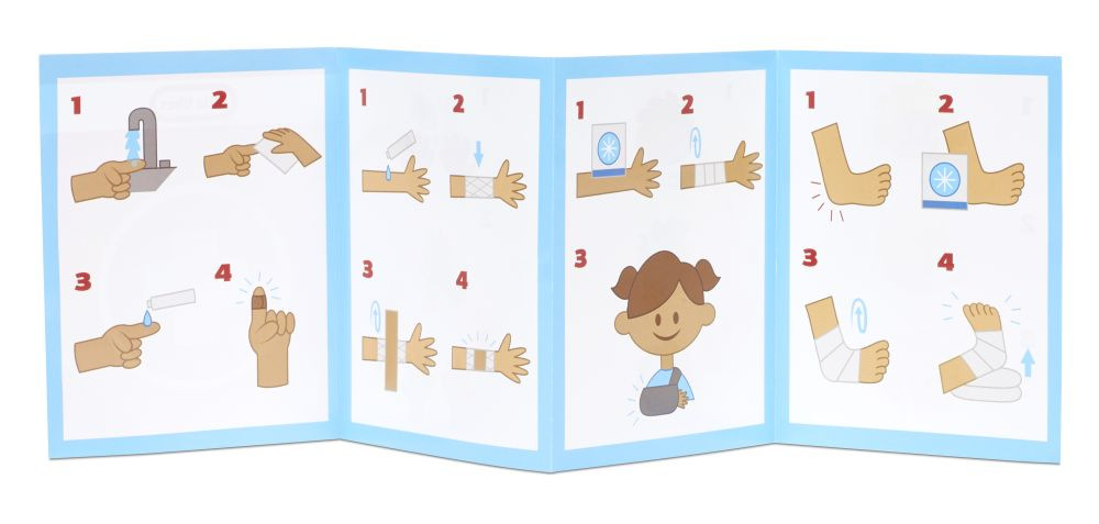 Bavte se přiložením gázy s obvazy na řezy a škrábance Předstírejte, že někomu změříte teplotu pomocí interaktivního teploměru Omotejte podvrtnutí obvazem a zajistěte ho suchými zipy K uložení příslušenství používejte kufřík Zahrnuje 25 lékařských doplňků, jako je obličejová maska, dezinfekční prostředek na ruce, prak na rameno, tuba na mast, brožura první pomoci, pinzeta, nůžky, studený zábal, špachtle do krku na jazyk a další!