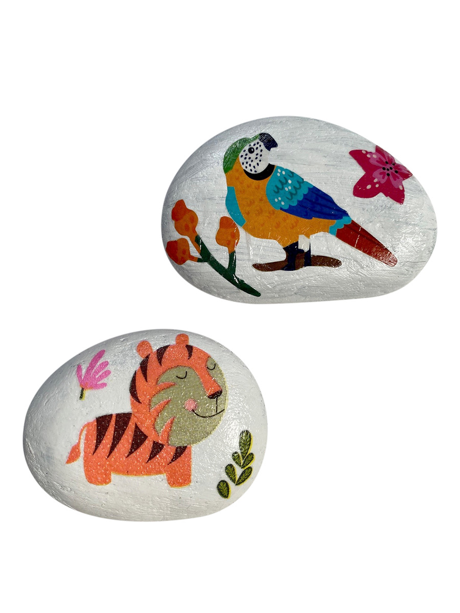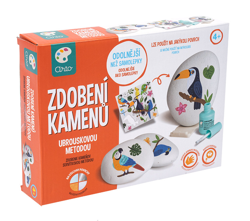 Ozdob si kámen. Sada obsahuje vše pro přípravu dekoračních doplňků - pomocí specielního lepidla si ozdob kamínek dle přiložených motivů. Součástí balení jsou i stojánky.