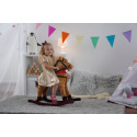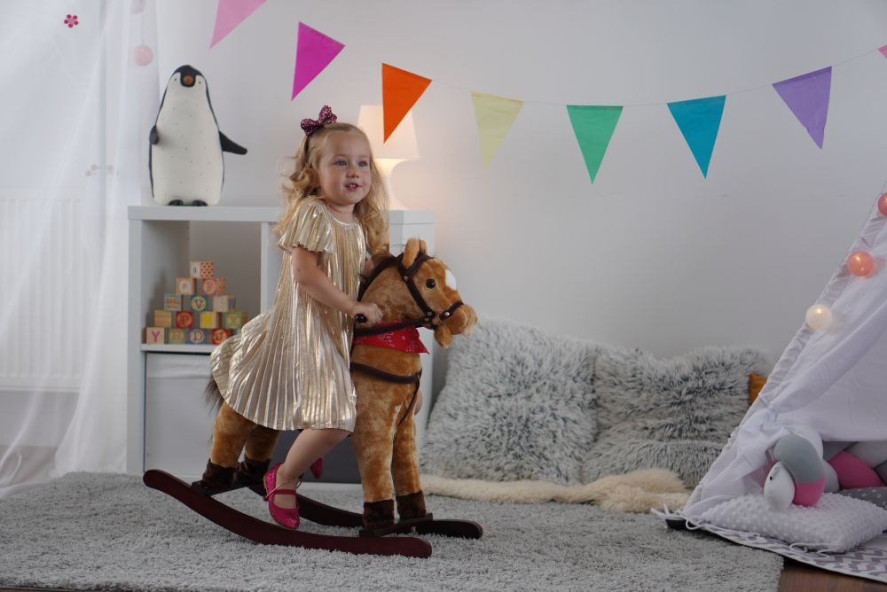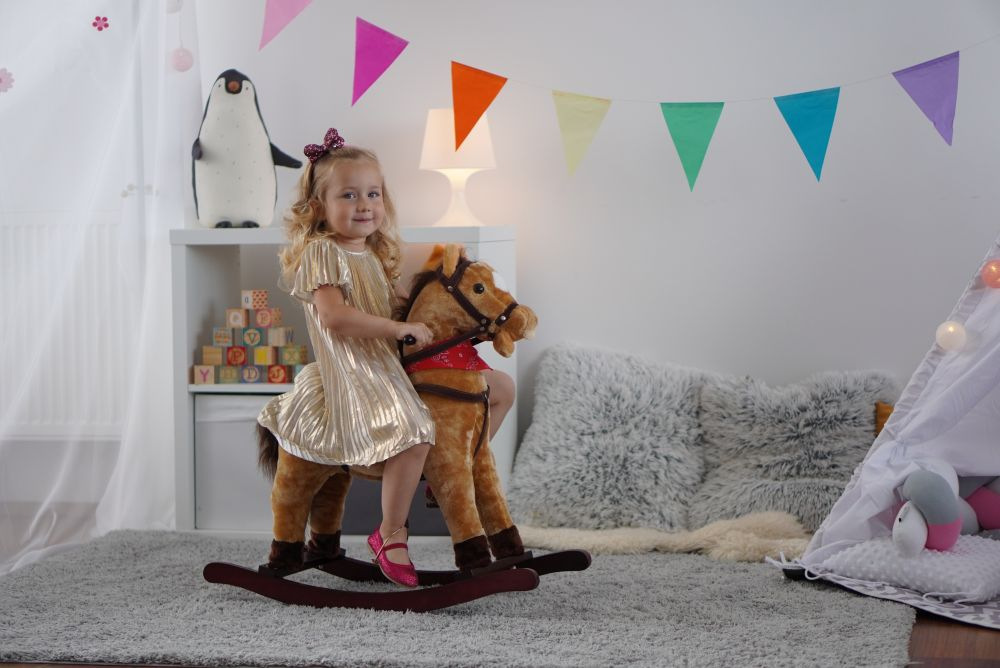 Hnědý houpací koník, který vydává zvuky při stlačení jednoho nebo druhého ouška. Řehtá a kluše. Na krku má moderní šátek. Koník je vyroben z kvalitní a hebké plyše. Nosnost 30 kg.