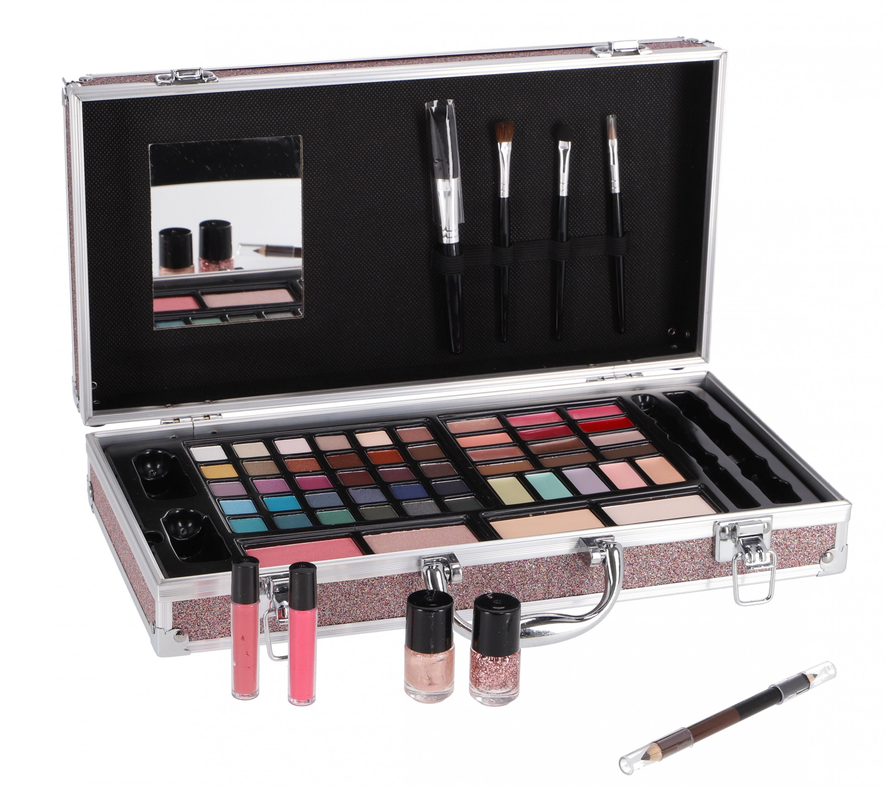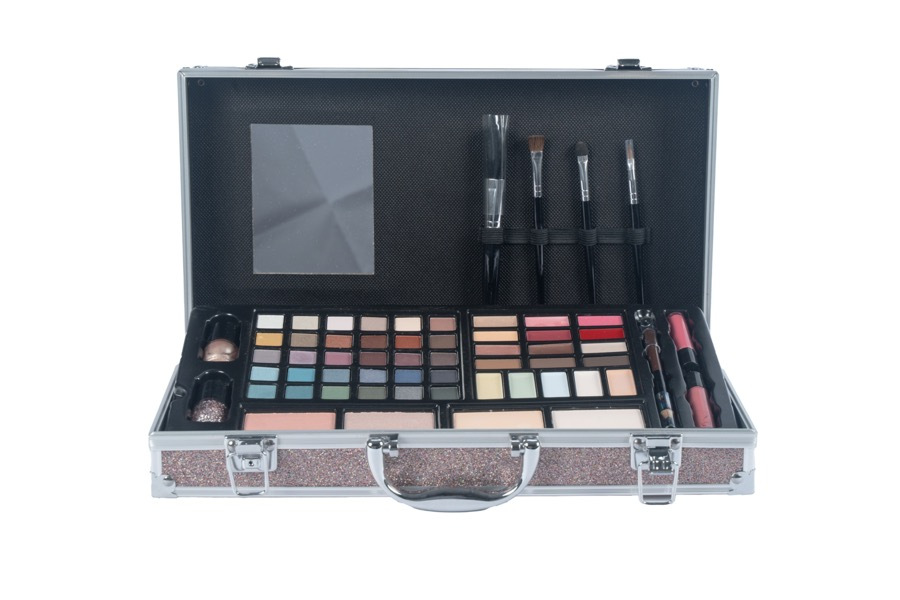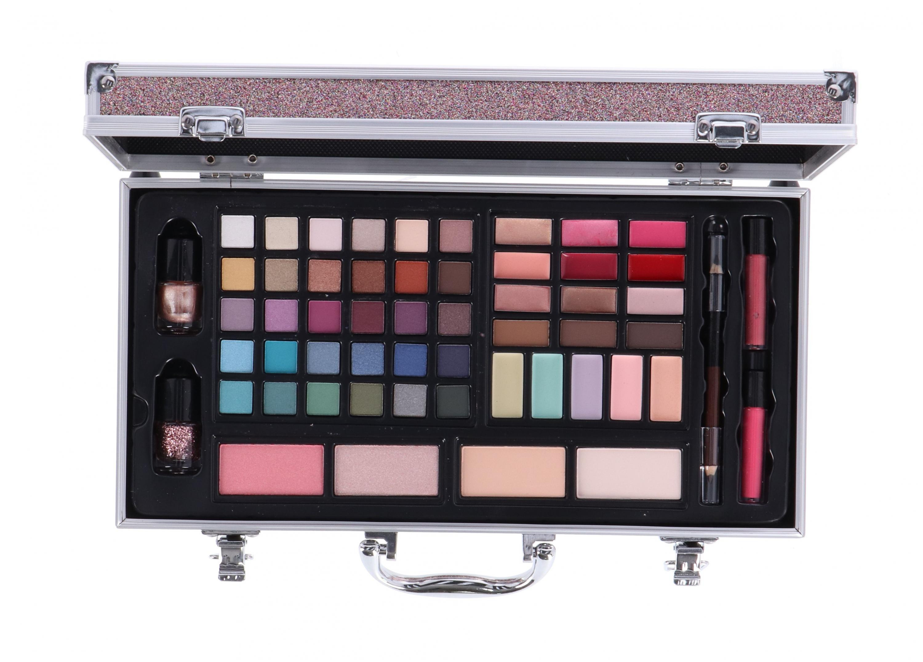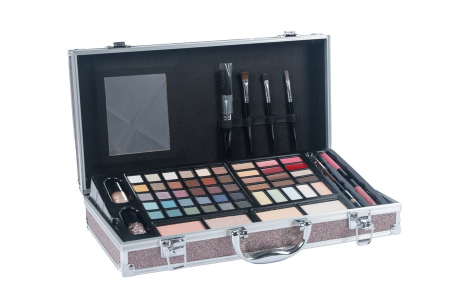 Kosmetický kufřík se zrcátkem. Obsah: 2 lesky na rty, 2 tvářenky, 2 pudry, 1 dvojitá tužka (2 barvy), 30 barev očních stínů, 3 krémové oční stíny, 3 barvy na obočí, 6 lesků na rty, 2 laky na nehty, 5 korektorových barev a 4 různé štětce.