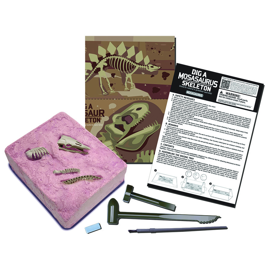 Části kostry Mosasaura jsou zaliti v sádře. Pokud si chceš postavit jeho kostru, musíš si části nejdříve vydlabat ze sádby. Sada rozvíjí dětskou motoriku a šikovnost.