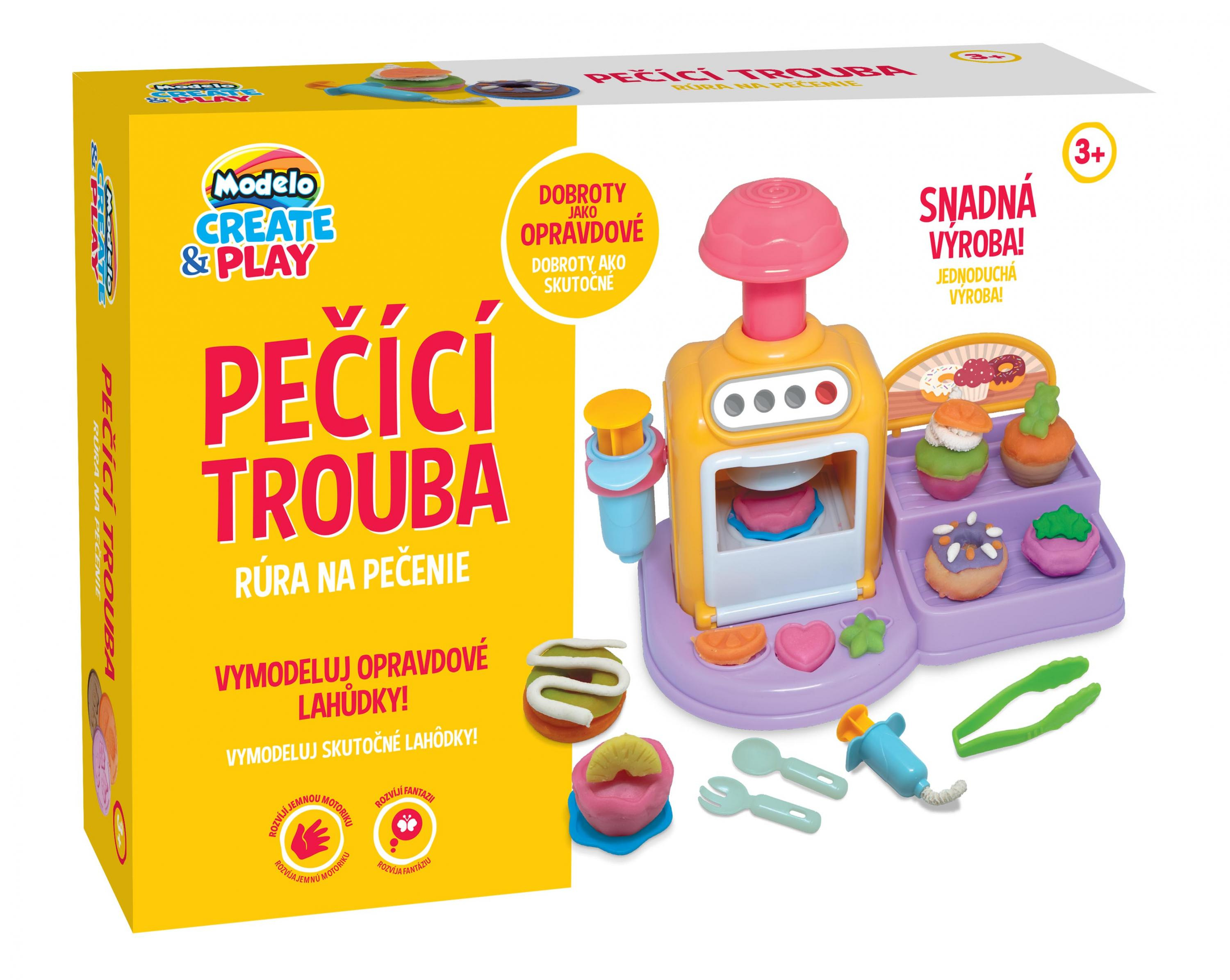 Sada modelíny, velké množství tvořítek a pečící trouba, ve které si děti upečou své dobroty. Vymodel