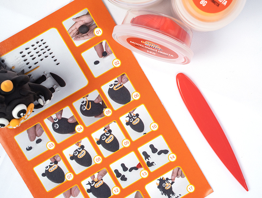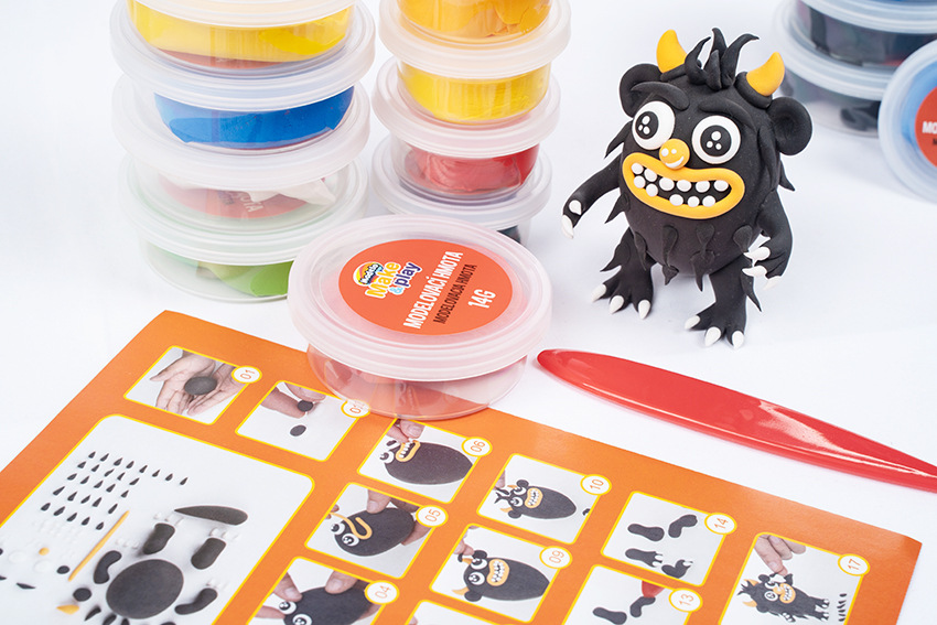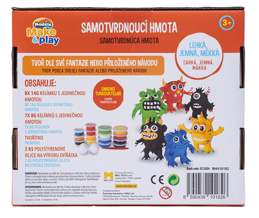 Samotvrdnoucí modelovací hmota. Prémiová kvalita, navíc oproti standardní modelíně po vymodelování na vzduchu sama vytvrdne. Děti si pak mohou se příšerkami dále hrát. Podporuje jemnou motoriku. alení obsahuje 15 tub modelíny.