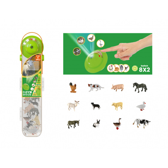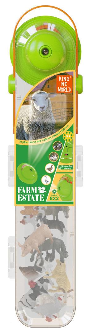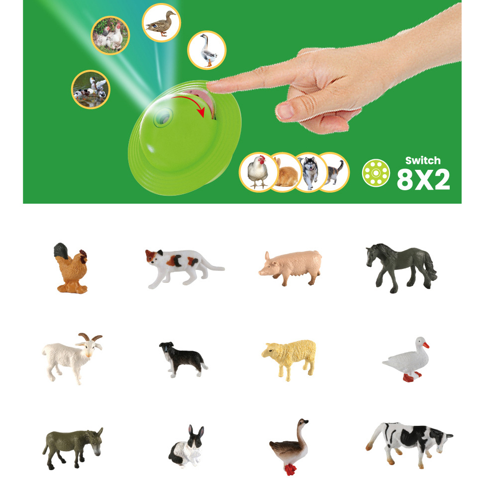 Projektor s motivy domácích zvířat: Hlavní částí sady je projektor, který po vložení jednoho ze dvou přiložených kotoučů promítá na stěnu nebo strop obrázky farmářských zvířátek. Projektor je navržen tak, aby se dětem snadno ovládal. Každý kotouč obsahuje sadu barevných obrázků známých domácích zvířat, jako je prasátko, kočička, koza, králíček a další.