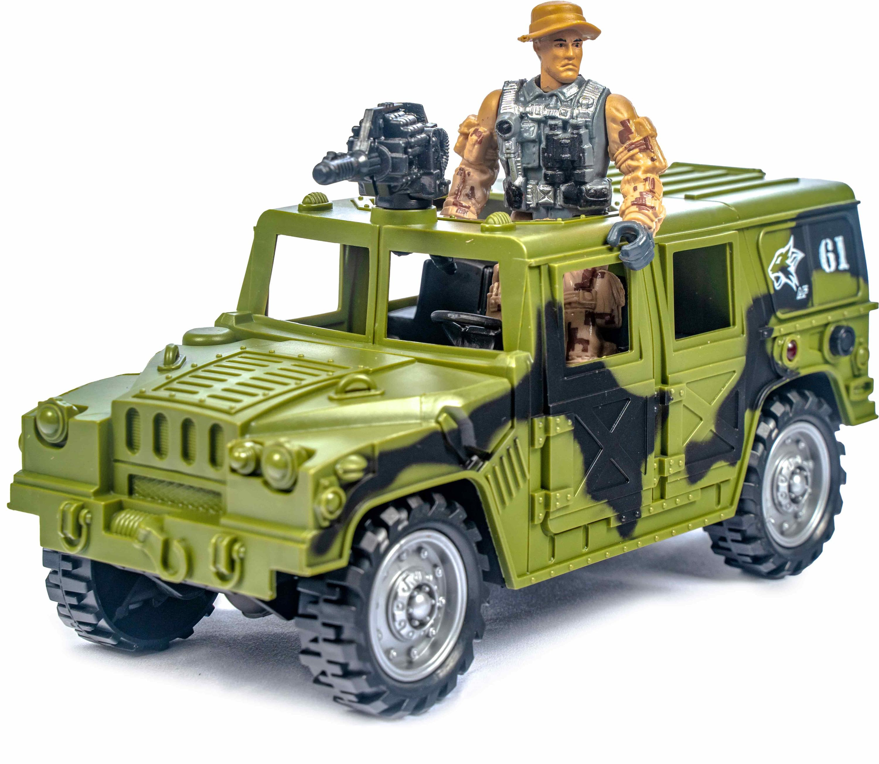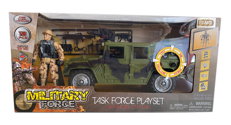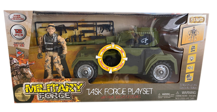 Vojenská sada se světelnými a zvukovými efekty. Obsahuje vojenské vozidlo, postavičku vojáka a další