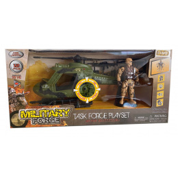 Vojenská sada se světelnými a zvukovými efekty. Obsahuje vojenské vozidlo nebo helikoptéru, postavič