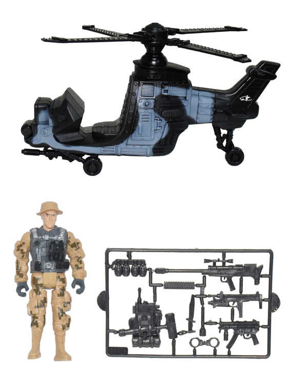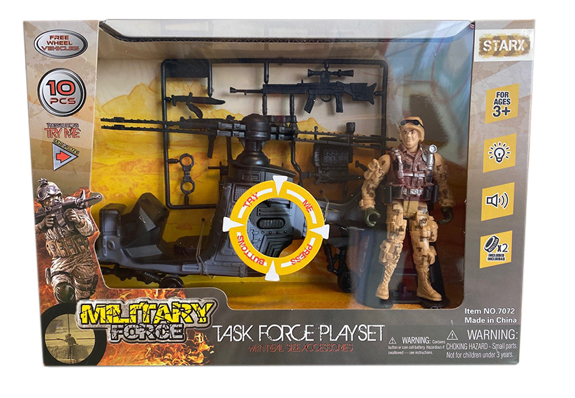 Vojenská sada se světelnými a zvukovými efekty. Obsahuje vojenské vozidlo nebo helikoptéru, postavič