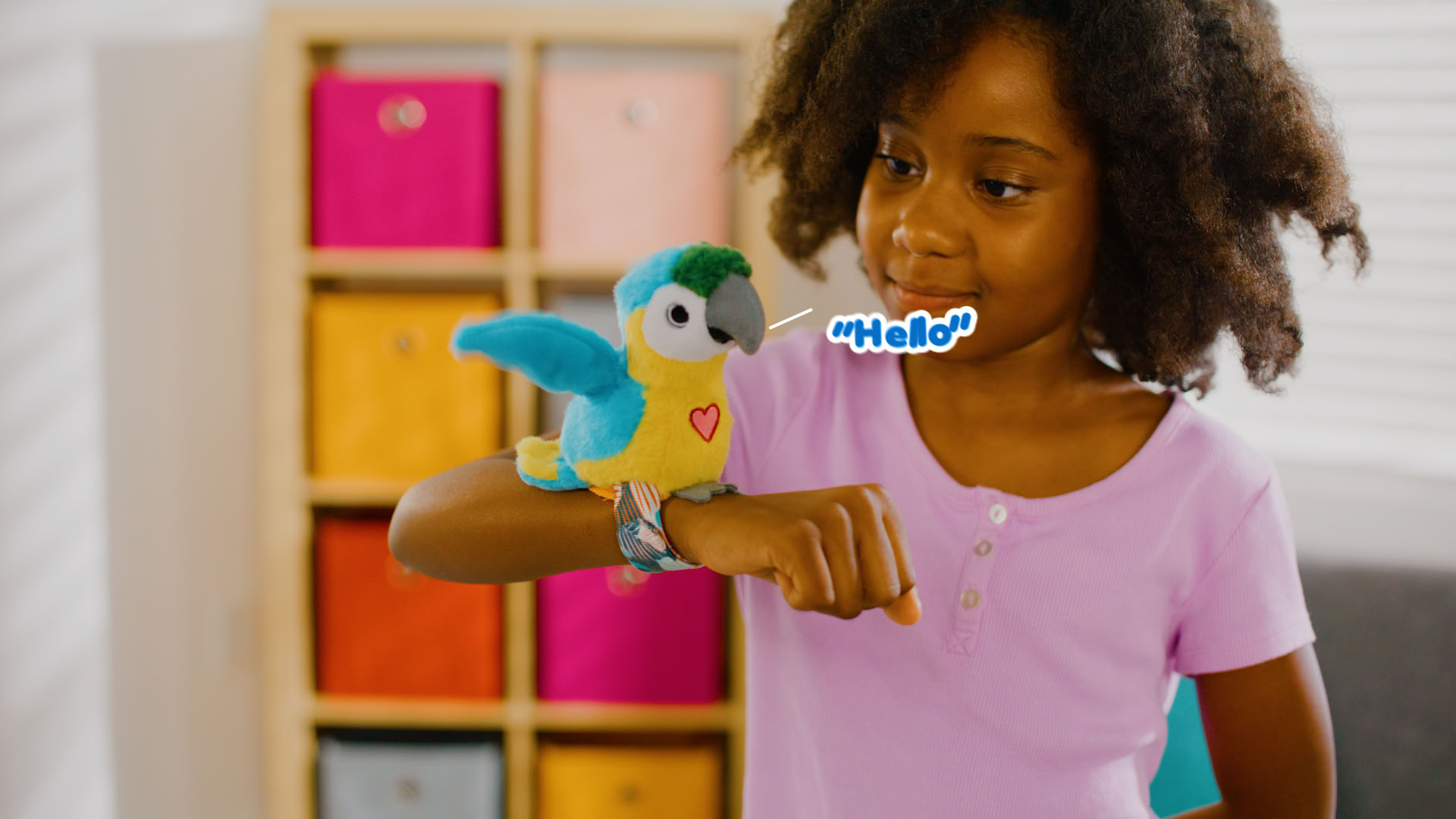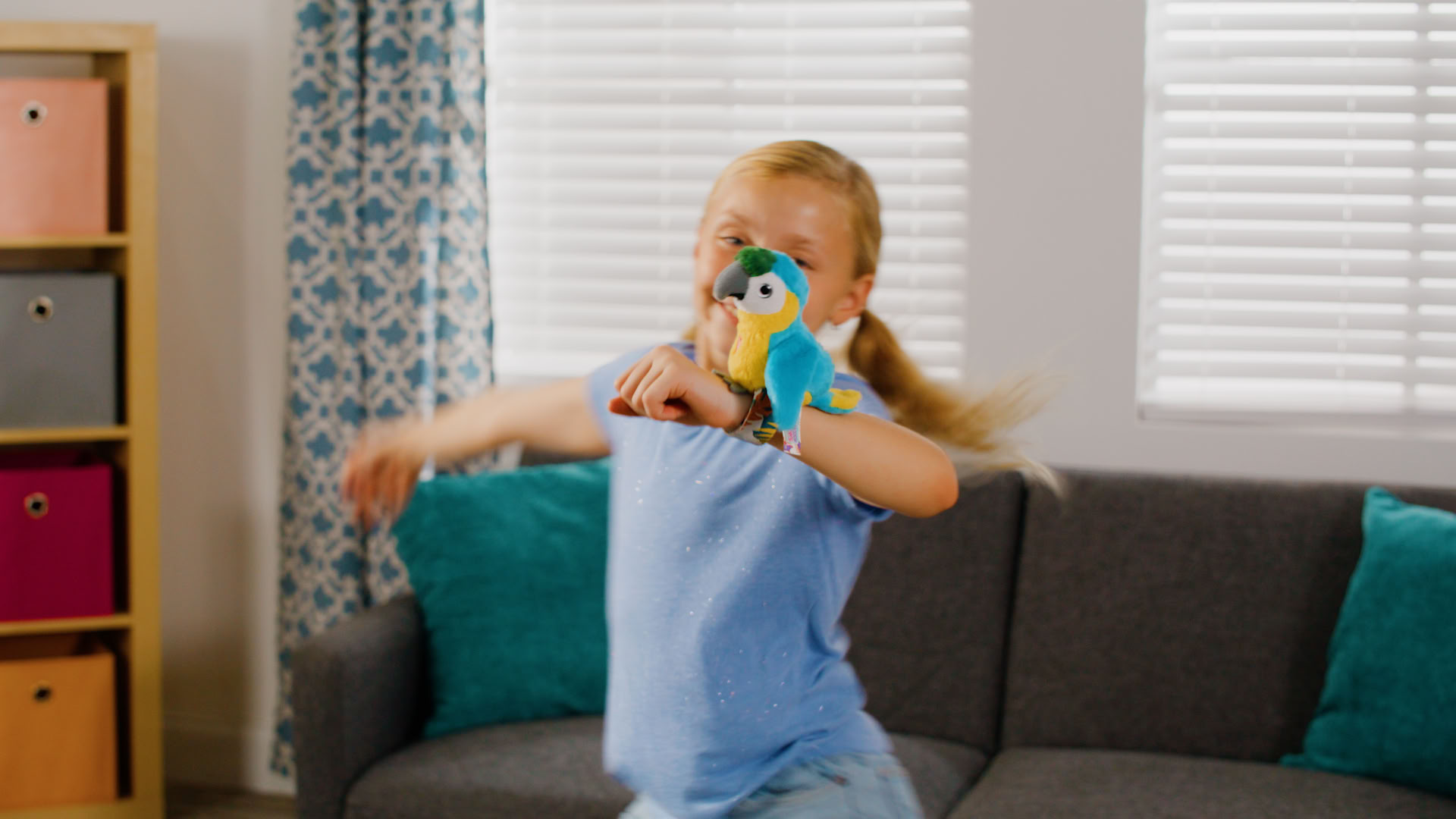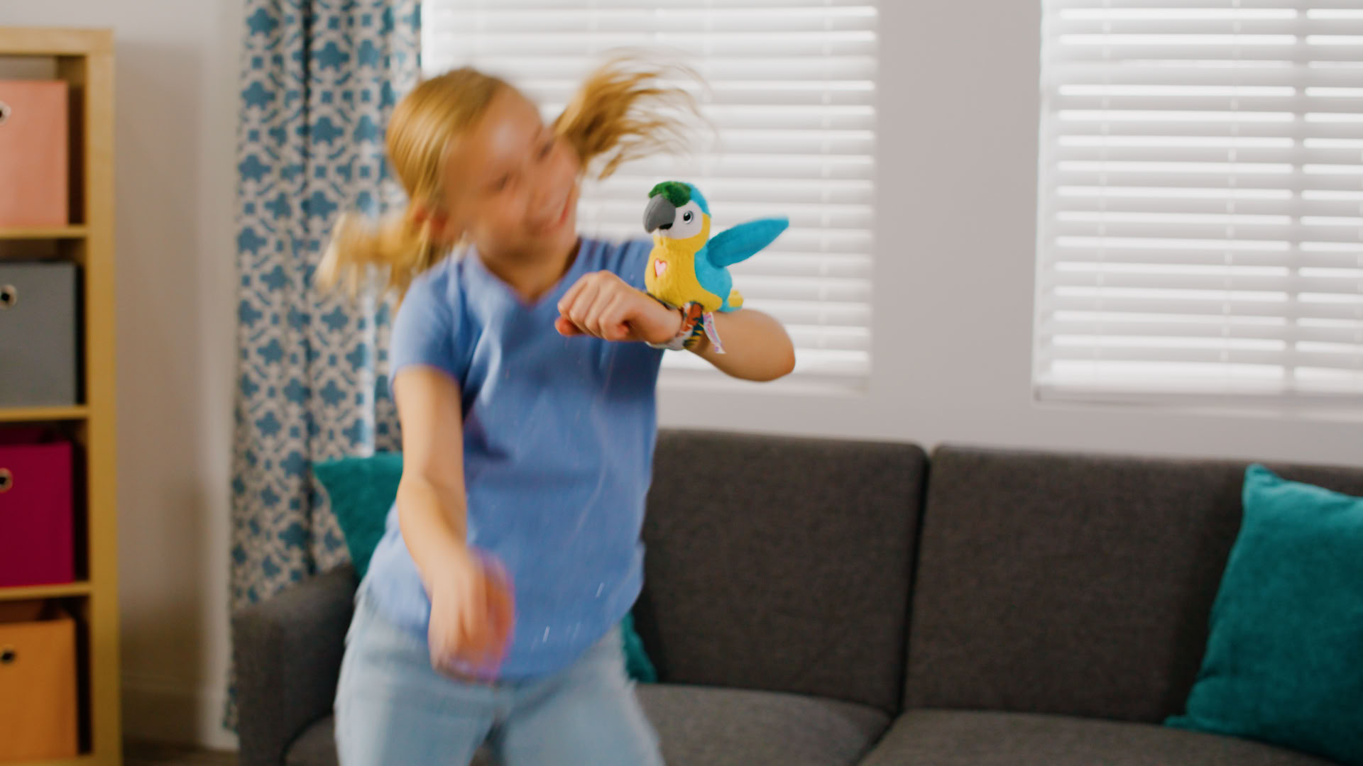 Ptáčka si můžeš připnout na ruku a užít si s ním spoustu zábavy. Opakuje, zpívá ptáčí písničku a mává křídly.