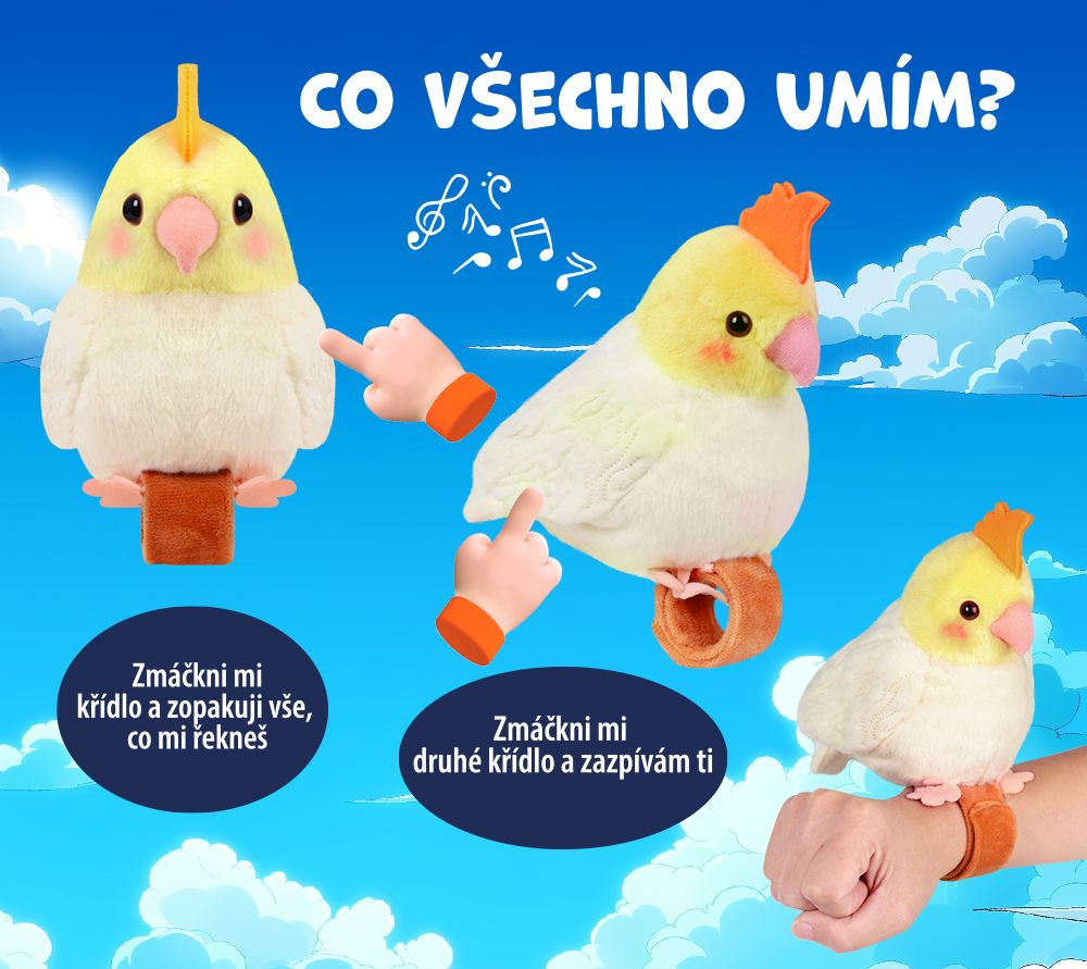 Vzhled ptáka je realistický, dvě tlačítka , jedním tlačítkem papoušek zpívá a druhým bočním tlačítkem s funkcí učení nahrávání (opakované mluvení) Součástí je náramek, díky kterému bude dítěti sedět na ruce.