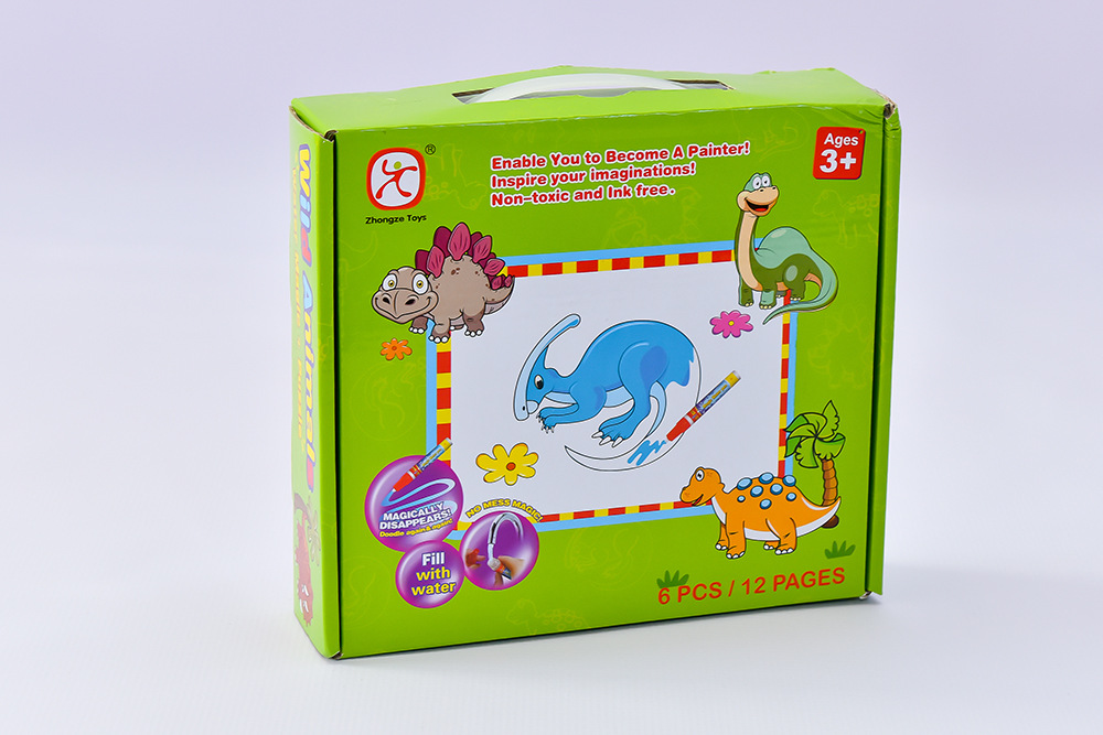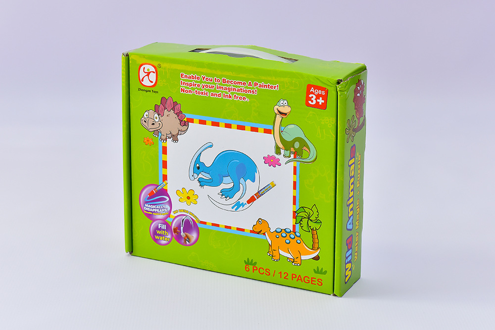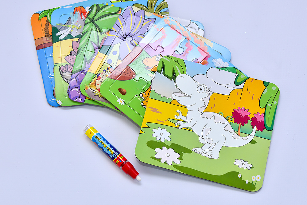 Z jedné strany vybarvovací omalovánky, které vybarvuješ tužkou, ve které je voda. Po zaschnutí můžeš opět barvit. Na druhé straně jsou velké puzzle.