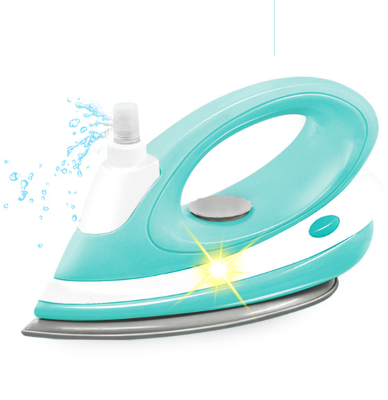 Žehlička v moderním designu, která svítí a rozprašuje vodu. Velikost 25x12x15 cm.