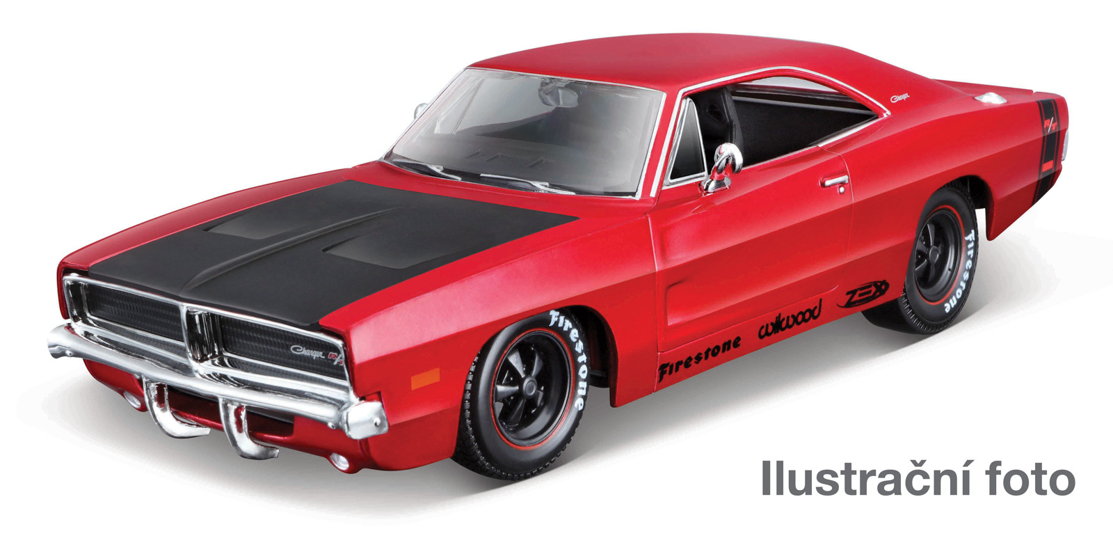 1969 Dodge Charger R/T. Model auta v měřítku 1:25 vyrobený z kovových a plastových dílů. Baleno v papírové krabičce s fóliovým průhledem. U modelu lze otevřít dveře, víko motoru a kufru. Rozměry balení: 24,4x11,1x13,3cm. Věk: 8+