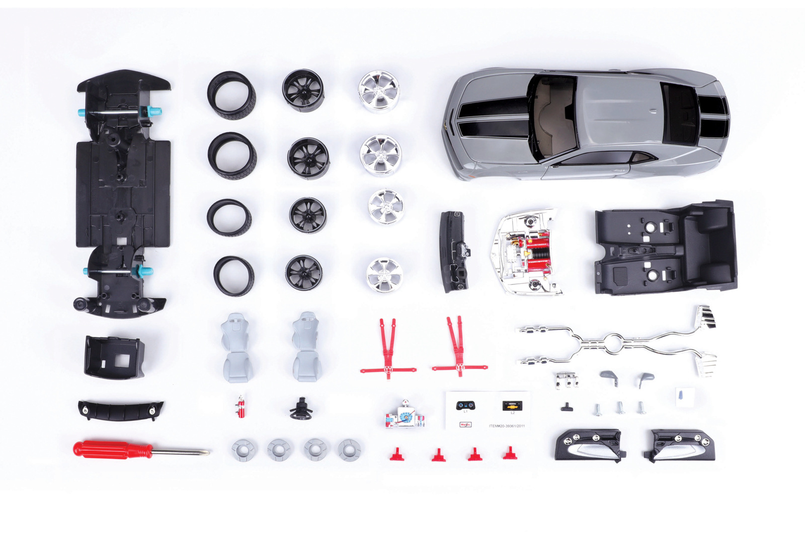 2010 Chevrolet Camaro SS. Model auta se skládá podle obrázkového návodu, který je součástí stavebnice. Jednotlivé části se spojují tlakem bez pomoci lepidla. Kovové části jsou natřené netoxickými barvami. Není potřeba je dobarvovat. Stavebnice obsahuje šroubovák. Otevírací dveře a kryt motoru. Baleno v krabičce. Nevhodné pro děti do 3 let. Rozměry balení: 16,8 x 22,9 x 10,2 cm. Věk: 8+