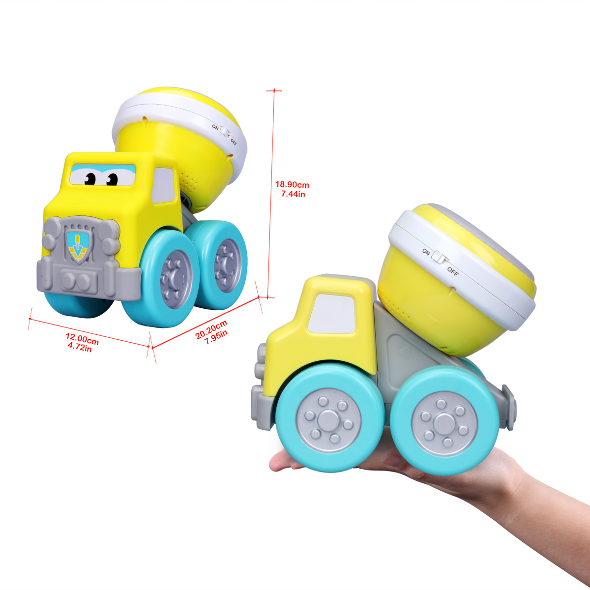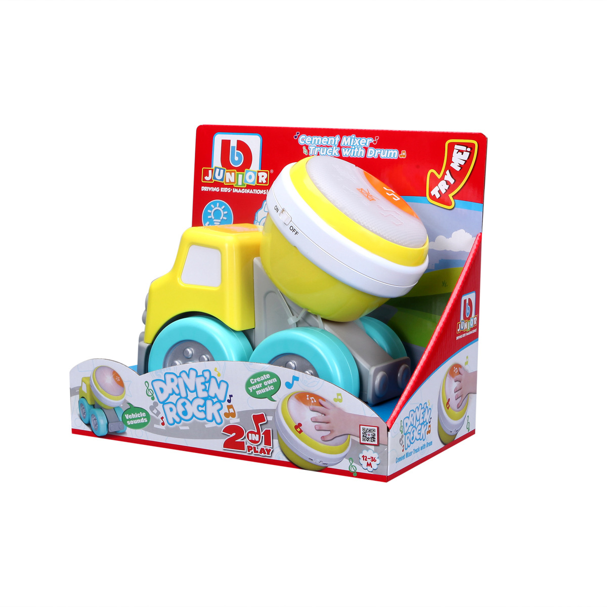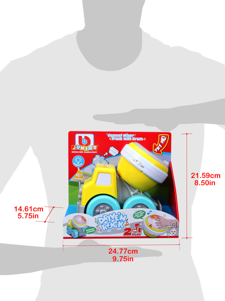 Míchačka na beton s bubínkem 2v1 z řady Drive' N Rock. Barevné auto s odnímatelným bubínkem. Bubínek má dva různé herní režimy, přednastavené melodie nebo variantu volné hry. S tímto autem můžete přinést Rock 'N Roll do pokojíčku svých dětí a naučit je nejen hrát hudbu, ale také podpořit rozvoj jejich koordinace ruka-oko. Autíčko je vhodné pro děti od 12 měsíců. Napájení autíčka je na dvě baterie AAA, které jsou součástí balení. Velikost autíčka je 7,9“ (20,06 cm). Rozměr balení: 21,6 x 24,8 x 14,6 cm.
