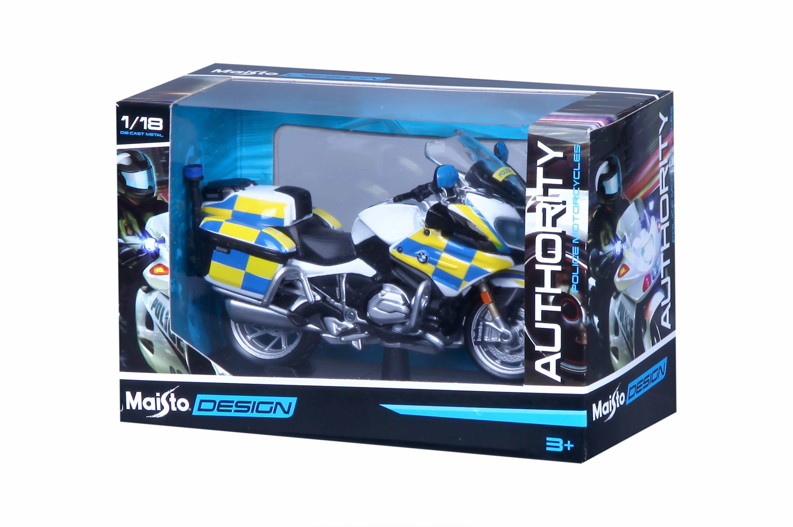 Design Authority Police Motorcycles. Kovové modely policejních motocyklů v modelovém měřítku 1:18. Varianty k dispozici: Police BMW R 1200 RT - Česká republika, Police BMW R 1200 RT - Německo, Police BMW R 1200 RT - Irálie, Police BMW R 1200 RT Velká Británie. Motocykly mají otáčivá řidítka a odpruženou zadní nápravu. Jsou usazeny na černém plastovém podstavci. Nevhodné pro děti do 3 let. Assort je náhodný mix modelů. Výběr nelze ovlivnit. Věk: 3+