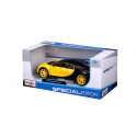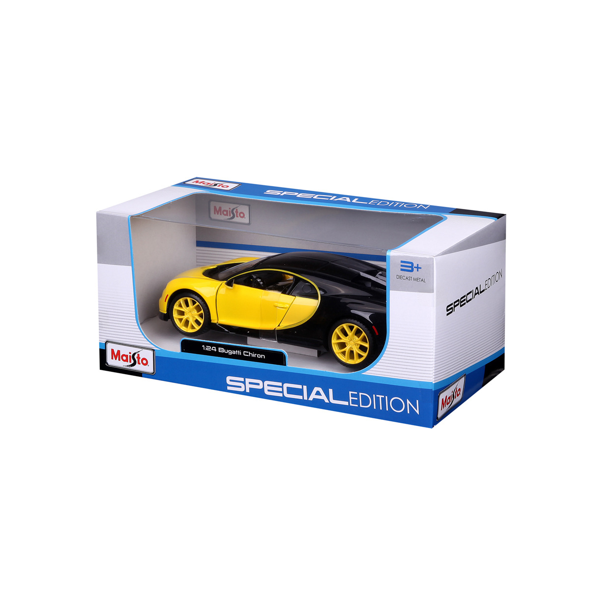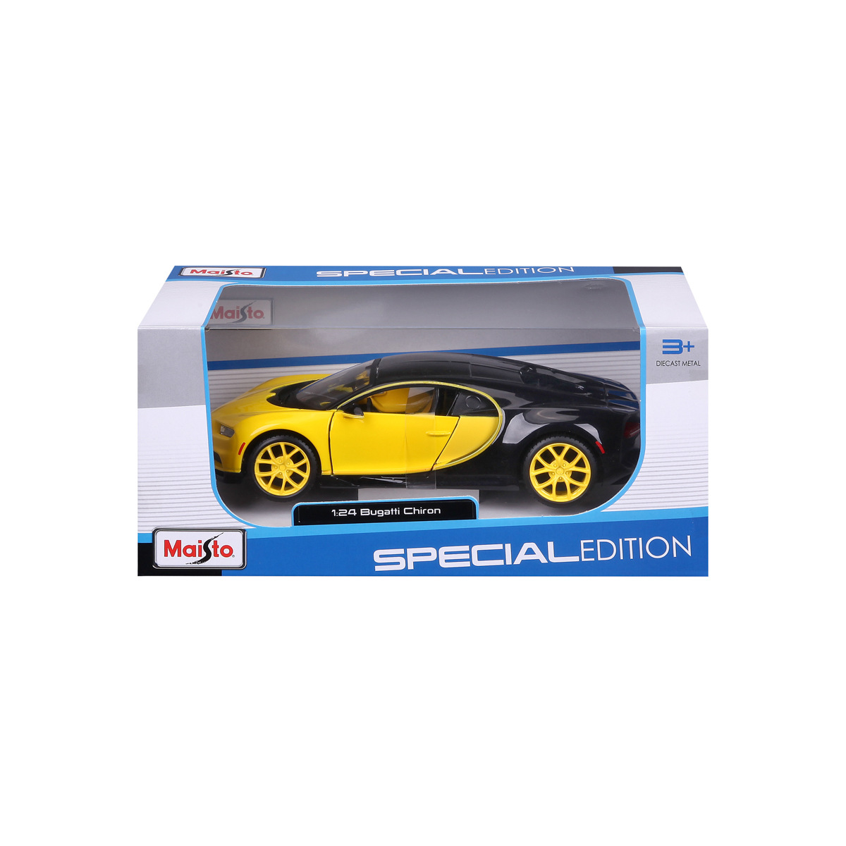 Bugatti Chiron. Kovový model sportovního auta značky Bugatti Chiron v měřítku 1:24. Model má velmi dokonalé, detailní provedení jednotlivých částí a kvalitní barevné provedení. Auto má otevíratelné dveře. Kovový model s plastovými doplňky v atraktivní žluto-černé barvě. Rozměry balení: 22,8 x 10,5 x 11,4 cm. Věk: 3+