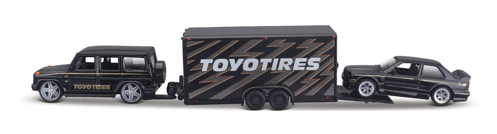 Mercedes Benz G Class + 1988 BMW 3 Series M3. Kovové auto s vlekem + kovové autíčko v měřítku 1:64. Modely autíček s perfektním propracováním a designem mají kvalitní kovové osy kol. Balení: 29,2x7,3x6cm Věk: 8+