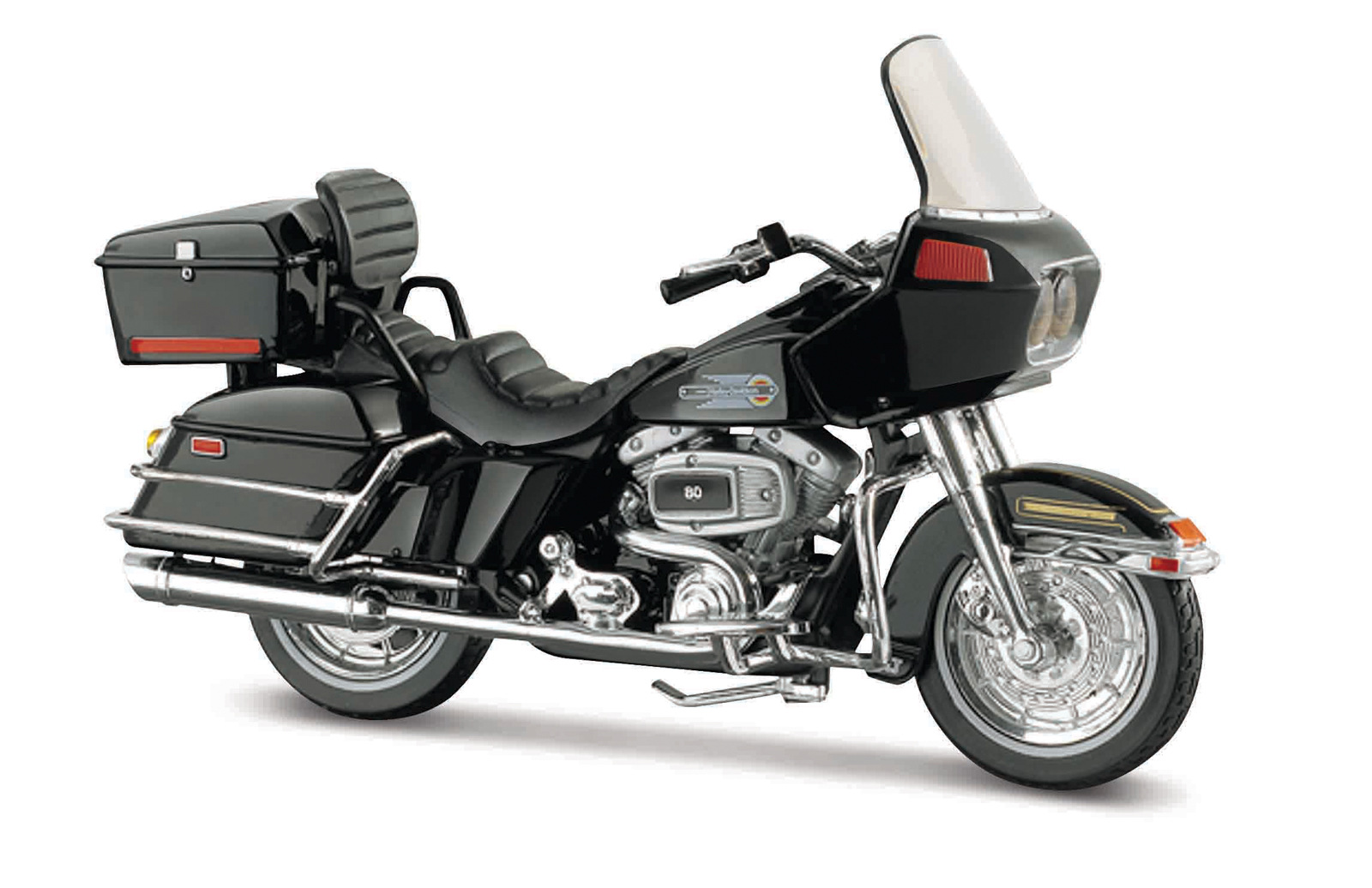 Harley-Davidson Motorcycles 1:18 – 1988 FLT Tour Glide ™, černá. Model ze série 45 collection v měřítku 1:18 má velmi dokonalé, detailní provedení jednotlivých částí a kvalitní barevné provedení. Kovový model s plastovými doplňky. Motocykl má řiditelnou vidlici, pohyblivý boční stojan a odpruženou zadní nápravu. Model je usazen na podstavci. Baleno v krabičce. Nevhodné pro děti do 3 let. Rozměry balení: 10,2 x 17,8 x 7 cm. Věk: 3 +