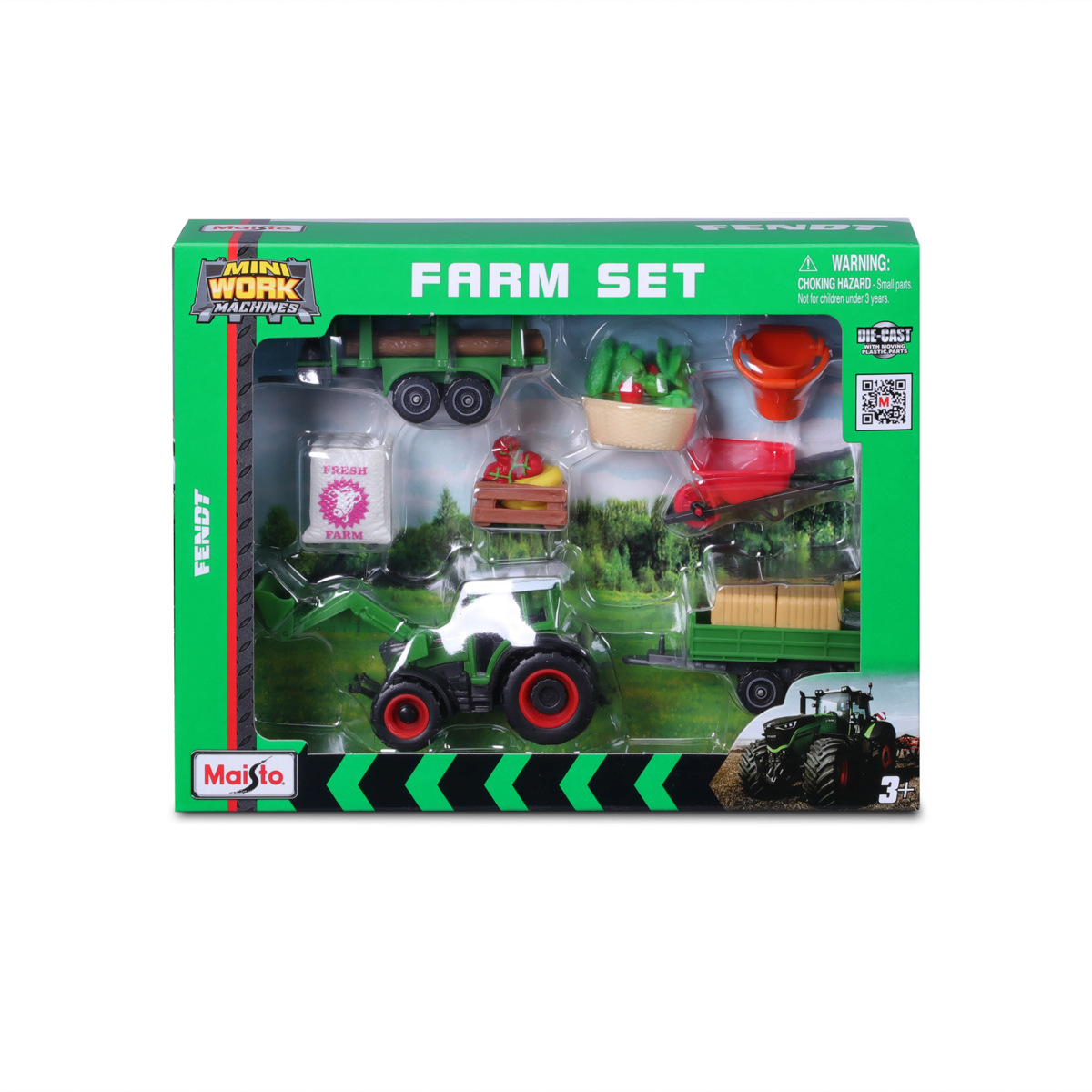 Mini Work Machines – Super farmářský set Fendt. Super set obsahuje: kovový model traktoru Fendt s plastovými detaily, přídavný traktor s buldozerem, dodávku, transportér, přívěs, strom, zeleninu a další příslušenství k sestavení vlastní farmy. Doplňky jsou vyrobeny z plastu. Součástí je také papírová hrací podložka o rozměru 29,7 x 21 cm. Model traktoru o velikosti 3'' (cca 7,5 cm) je vyroben z tlakově litého kovu. Rozměry balení: 23,2 x 20,49 x 4,45 cm. Věk: 3+