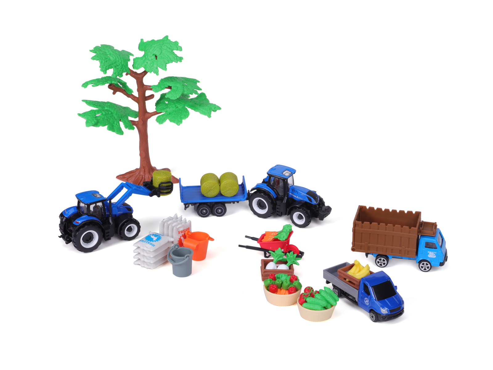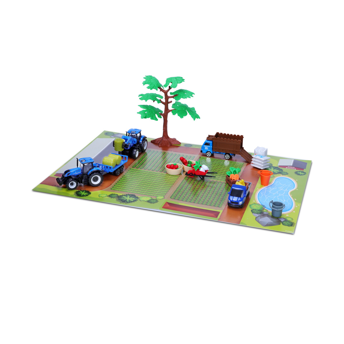 Mini Work Machines – Super farmářský set New Holland. Super set obsahuje: kovový model traktoru New Holland s plastovými detaily, přídavný traktor s buldozerem, dodávku, transportér, přívěs, strom, zeleninu a další příslušenství k sestavení vlastní farmy. Doplňky jsou vyrobeny z plastu. Součástí je také papírová hrací podložka o rozměru 29,7 x 21 cm. Model traktoru o velikosti 3'' (cca 7,5 cm) je vyroben z tlakově litého kovu. Rozměry balení: 23,2 x 20,49 x 4,45 cm. Věk: 3+