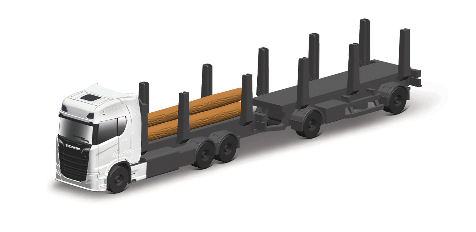Přívěs Volvo FH16 pro těžbu dřeva. Velký a silný tahač, který veze mini verzi pracovního stroje. Kovové autícko s plastovými detaily a opravdovými gumovými pneumatikami. Balení: 27,5x8x4,8cm. Věk: 8+
