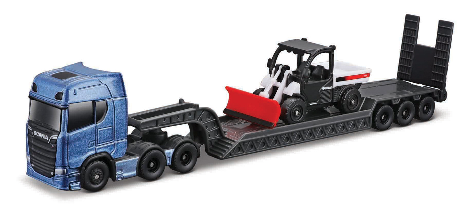 Scania 770S with Toolcat 5600 + Bucket. Velký a silný tahač, který veze mini verzi pracovního stroje. Kovové autícko s plastovými detaily a opravdovými gumovými pneumatikami. Barevné provedení výrobku a design se může lišit. Balení: 27,5x8x4,8cm. Věk: 8+